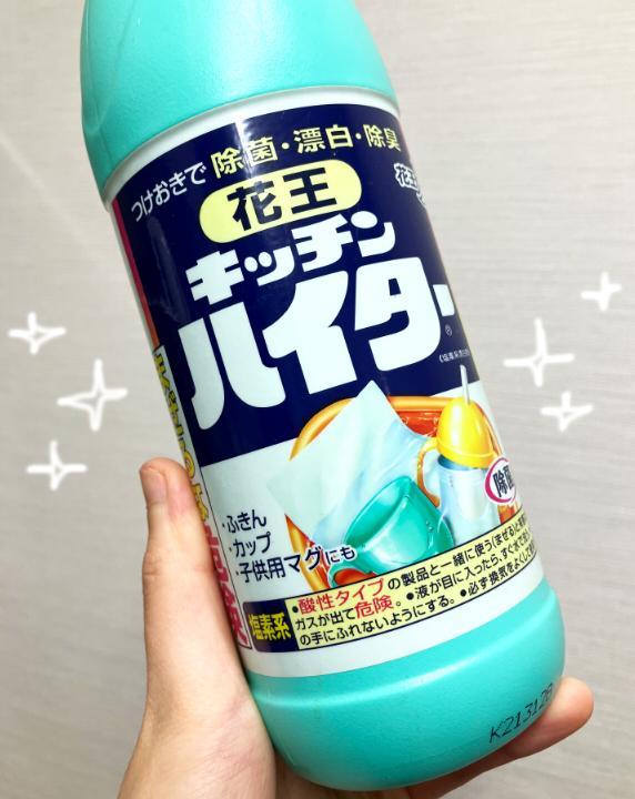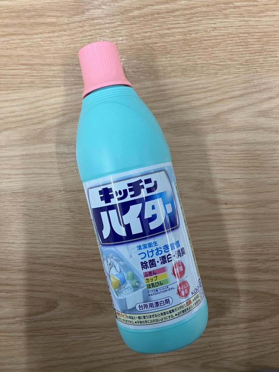 ちょっとした汚れが酷いときにこのキッチンハイターをつけ置きにしておくとあっという間に汚れが落ち、すごく助けられている!また除菌、漂白にも適していて有難い!