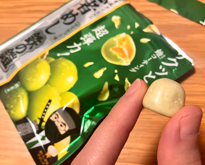 グミの表面はつるつるにコーティングされていて、噛んでみると確かにグレープの時よりもしっかりと噛めてしまいます。中からもハード食感のグミが出て来て、食感が楽しめます。甘いマスカットの味はおいしいですが、忍者めしは硬さを楽しむことがメインだと思っているので、変化が残念でした。噛むほどに顎がズレるかとドキドキしながら食べていたのを寂しく思い出しながら食べました。以前の硬さに戻ってほしいです。