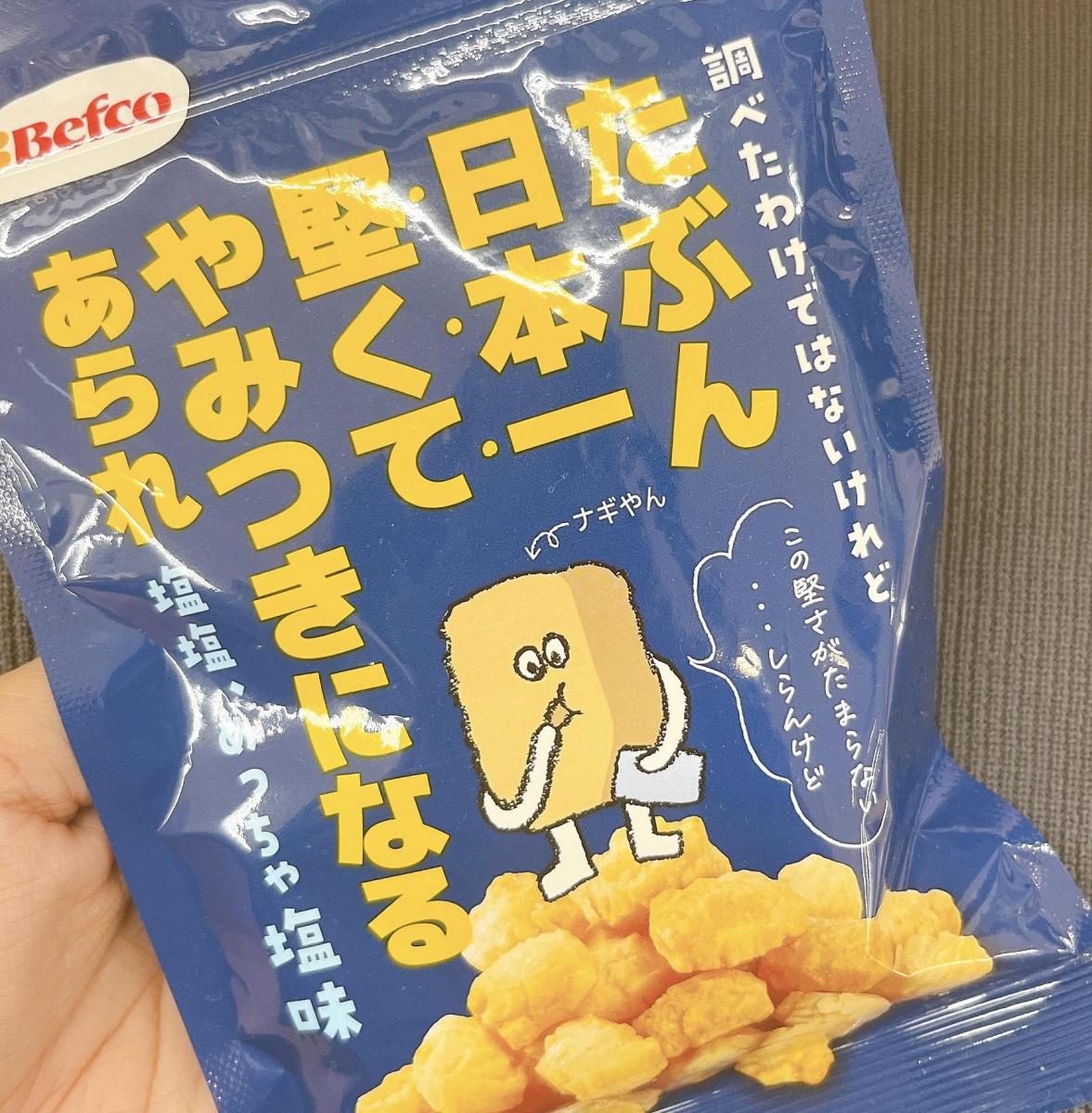 パッケージのネーミングに惹かれて購入してみました。ジップ式なので持ち運べて大変便利です。中には結構小さめのあられが入っており、食べるとしっかりと堅めでしたが、歯ごたえあっていい、やみつきになるような食感でした。しお味もしっかりと感じられるのでおつまみにもぴったりな味わいだなと思います。コスパもいいのでまた買いたいなと思いました。