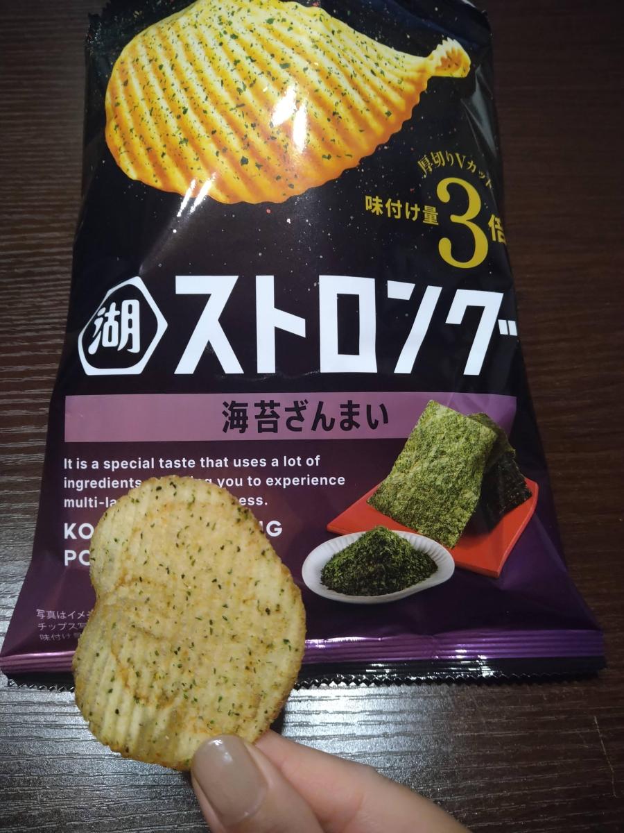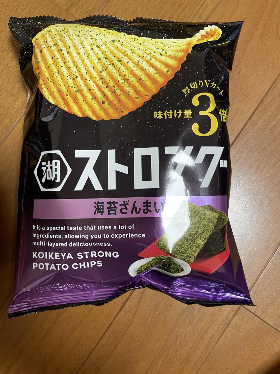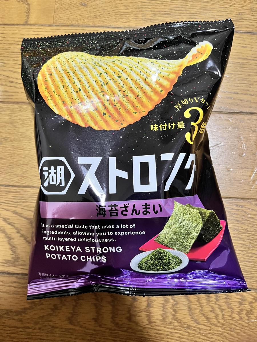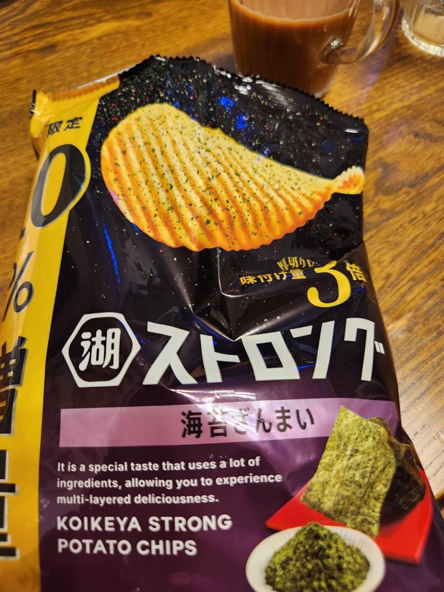 固いポテチなのかなーとおもいきや、味付け量3倍のストロングなのですね。ガツっとおいしいポテチでした。ギザギザの断面の食感も楽しいです。海苔とごま油のおいしさもそうですがポテト自体の旨味も楽しめます。