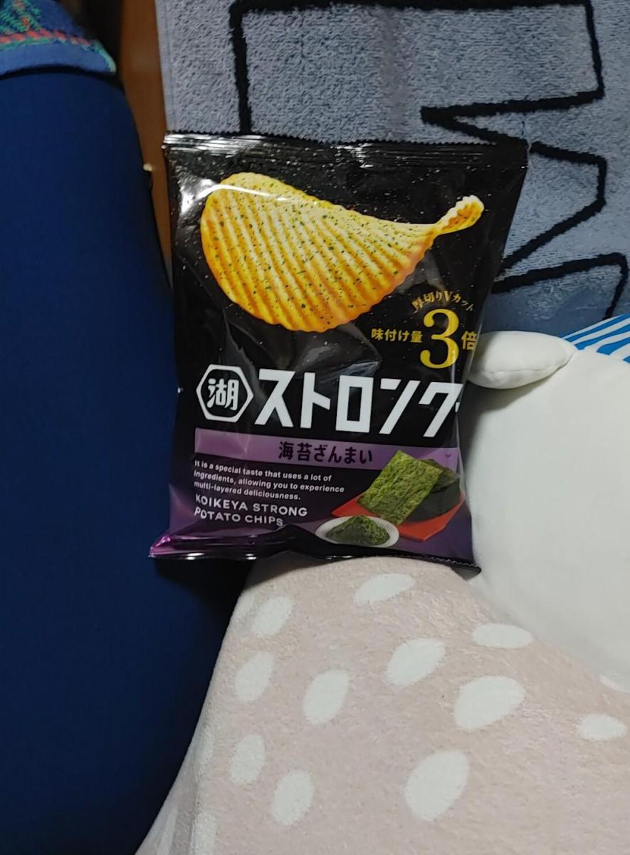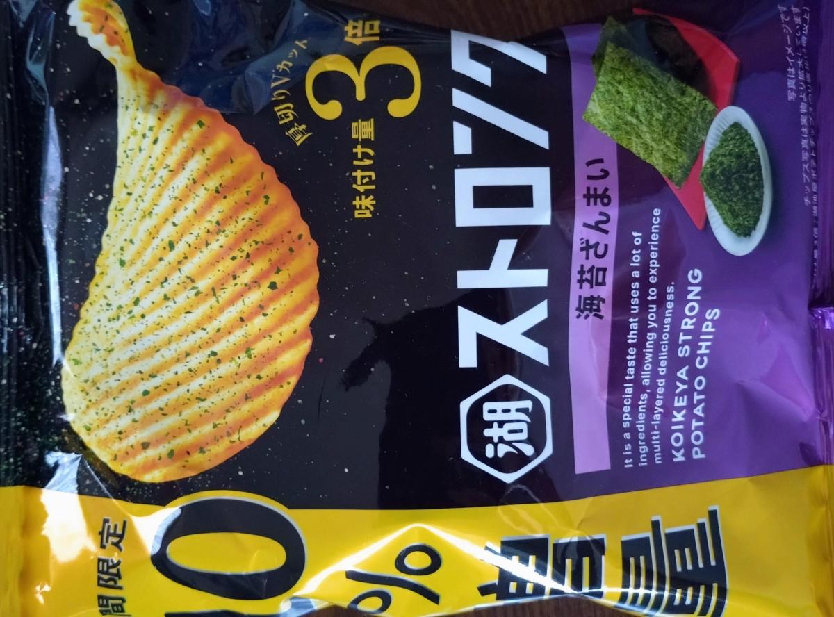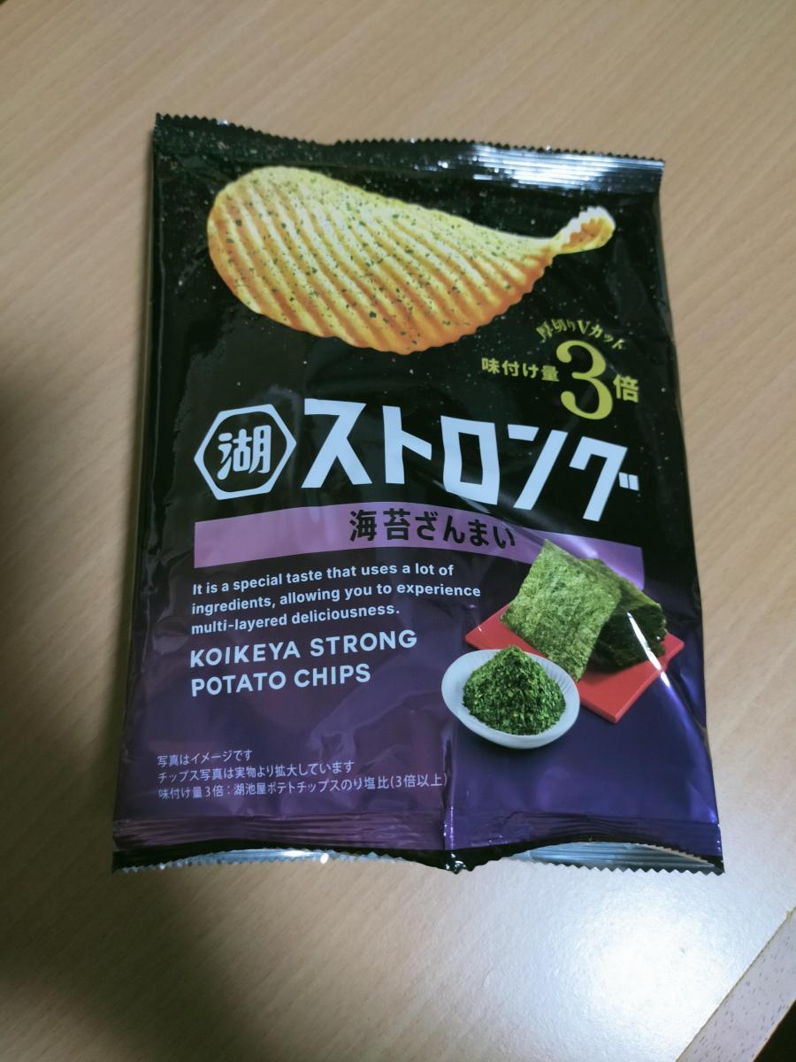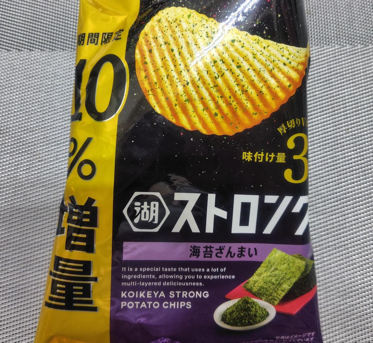 固いポテチなのかなーとおもいきや、味付け量3倍のストロングなのですね。ガツっとおいしいポテチでした。ギザギザの断面の食感も楽しいです。海苔とごま油のおいしさもそうですがポテト自体の旨味も楽しめます。