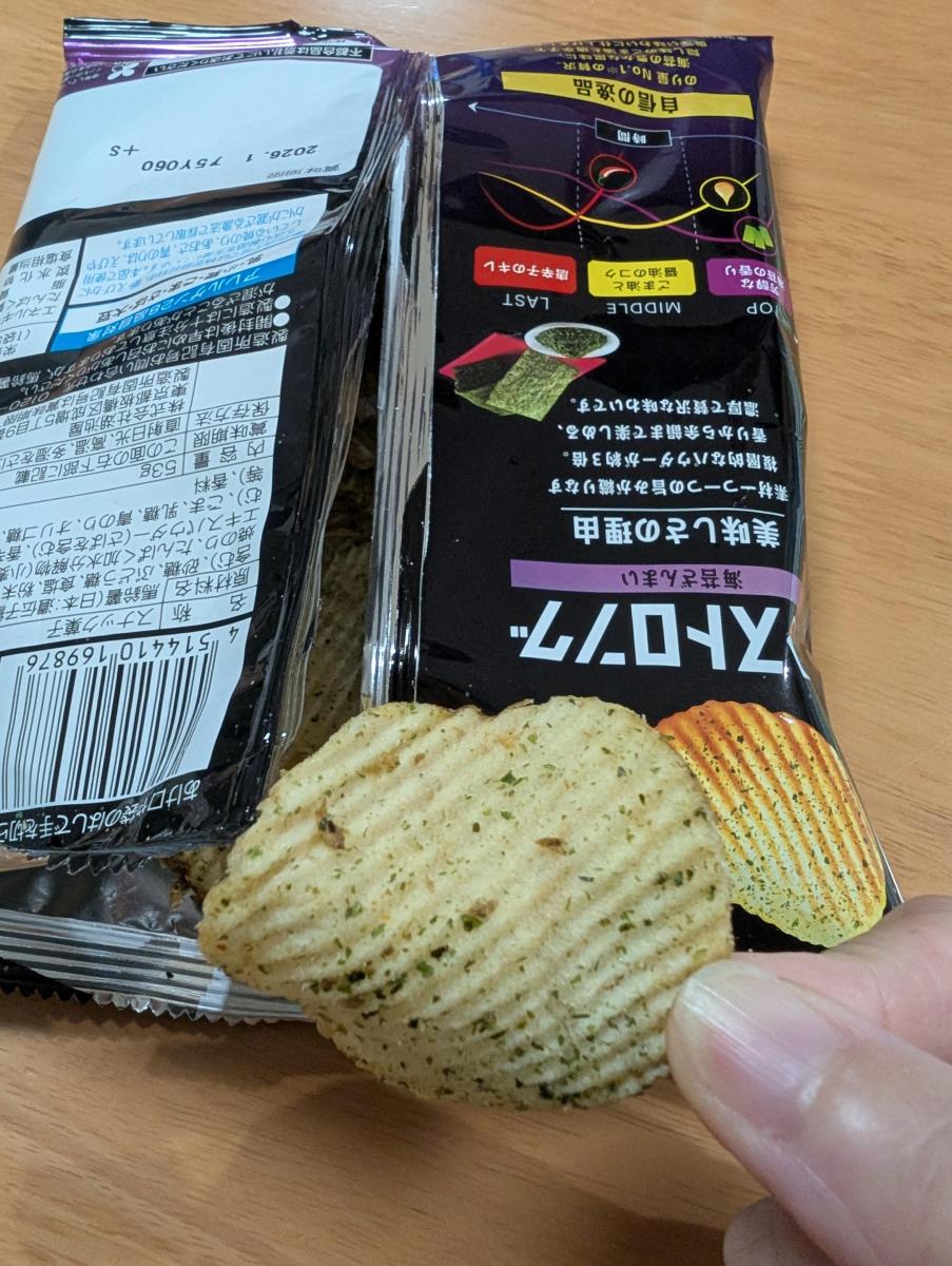 ギザギザの形のポテトチップスで食べ応えがあり、海苔の風味もしっかり感じられ、ただののりしおとはまた違った味わいが感じられます。