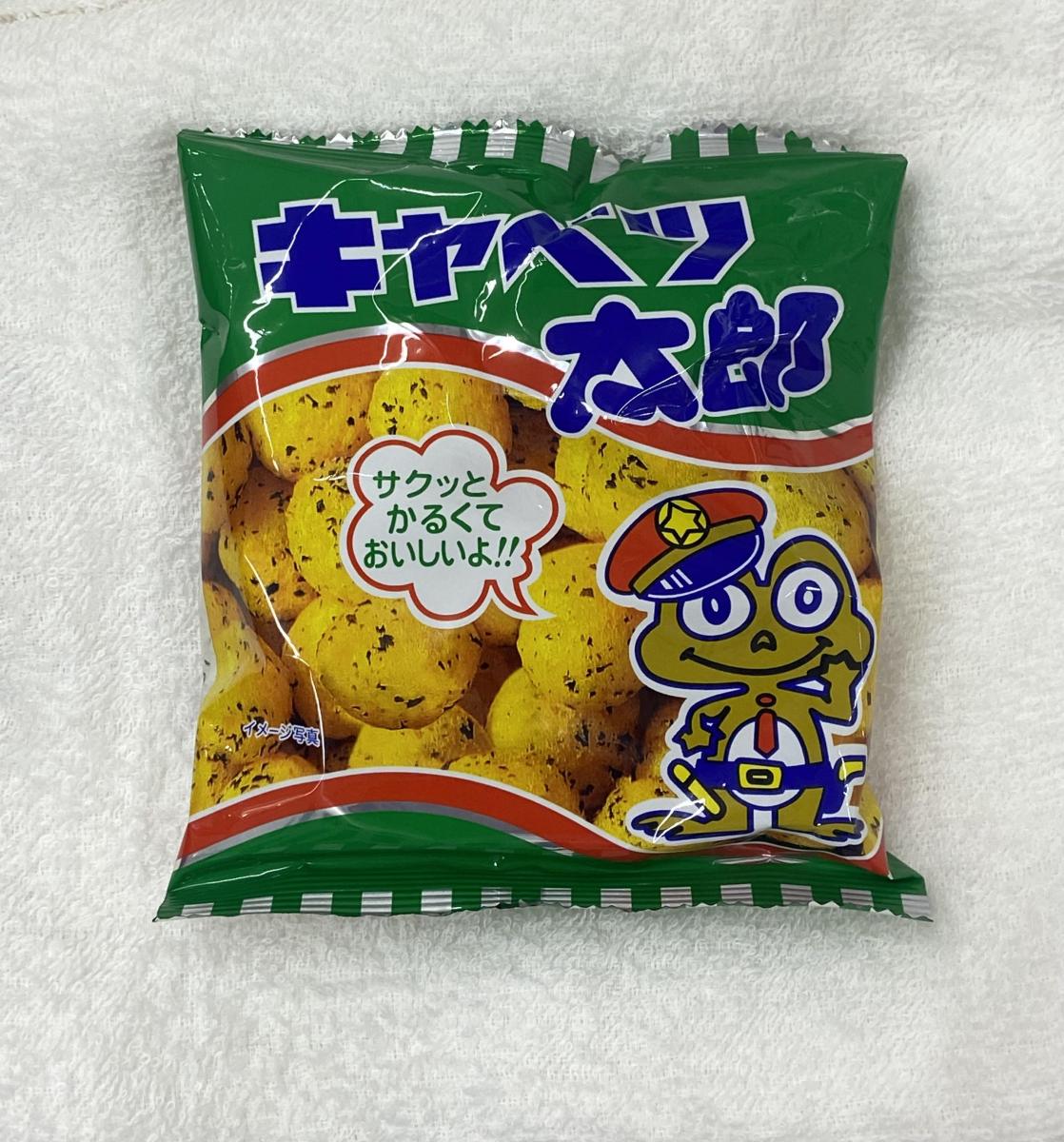 キャベツは入ってないようですがキャベツのような味はします。アオサとソースの味もするのでお好み焼きのような味かな。子どもの頃はあまり食べた記憶がなかったキャベツ太郎、美味しいです!小袋14g入りだから一人で食べるときにちょうど良い量。うちの近所だとヤオコーというスーパーで4袋100円で売っています。