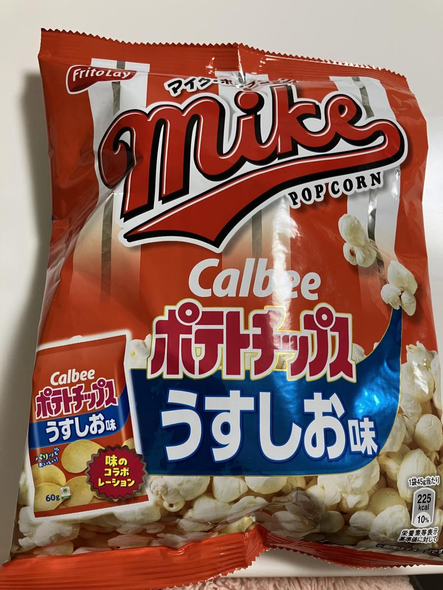 マイクポップコーンは手軽にポップコーンが楽しめる定番商品ですね。こちらのフレーバーについては、カルビーポテトチップスのうすしお味ということで、通常の塩味に比べると塩気がマイルドです。