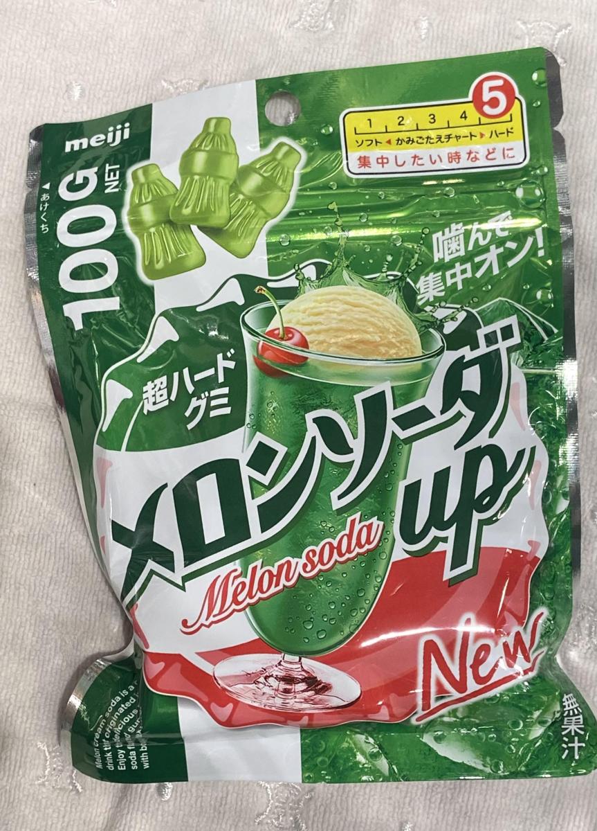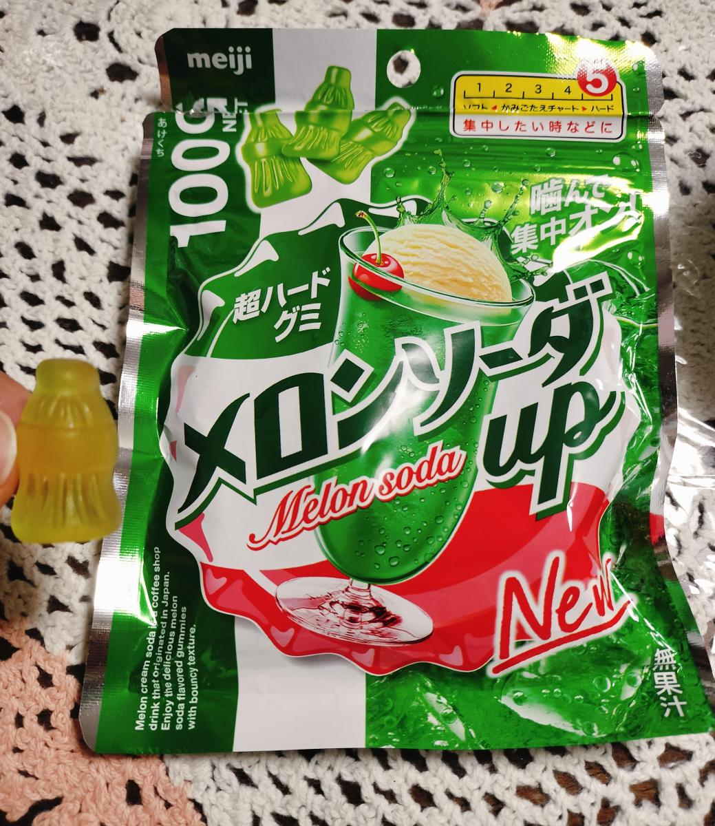 ハードグミにメロンソーダがついており、食べてみると、メロンソーダのようなじゅわっとした感じが脳に伝わり、おいしく食べることができました。ハードグミなので食べ応えもあります。