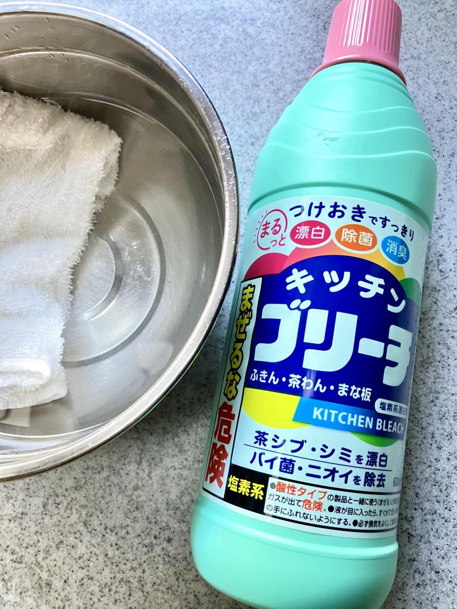 キッチンブリーチを水で薄めてつけ置きしておくだけでふきんの漂白ができて除菌もできるので衛生的で、まな板も綺麗になり安心して使えます。