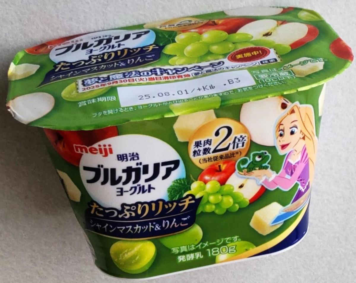 シャインマスカットは言いすぎだなー。子供のころ大好きだったマスカットの飴の味がする。角切りりんごのシャキシャキ感にマスカット飴の味がしておいしい。果肉はりんごなんだけど、だんだんマスカットを食べているような気もしてくる…不思議な魔法。それもそのはず、今ブルガリアヨーグルトは絶賛ディズニーコラボ中。マスカットとりんごのデザインにパスカルとラプンツェルが不思議なぐらい調和していてとってもかわいい。りんごをマスカットに感じちゃうのもネズミの国の夢と魔法の仕業かな。