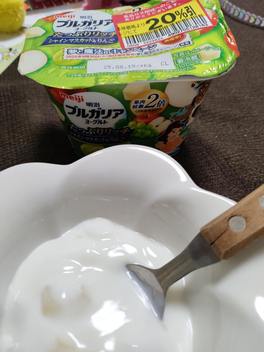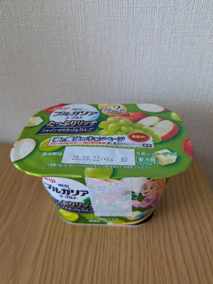 シャキシャキ食感のりんごとシャインマスカットが入った少し甘めのヨーグルトです。パッケージがディズニーでかわいいので、子供が気に入って食べています。少し量が多いので、半分にわけて朝食に食べています。
