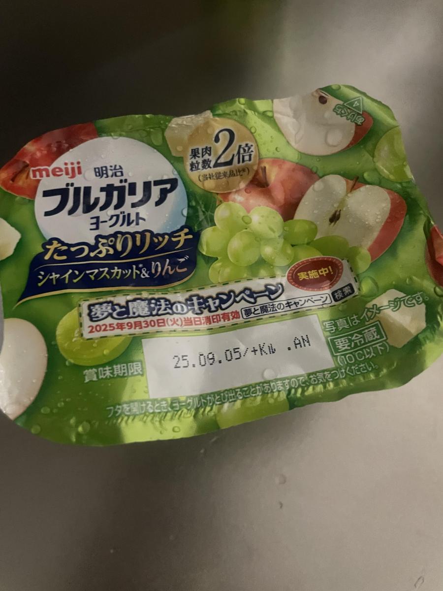 シャインマスカットが主役のヨーグルトたと思って購入したが、食べてみるとリンゴ果肉のシャキシャキ感はしっかりと感じられるのにマスカットの食感は全然なくて、原材料を見てみると、シャインマスカットはない!!要するにシャインマスカットは香料での味つけだけということで、「は?」という感じ。確かに味はシャインマスカットの爽やかさがあって悪くないと思うが、これだけ全面に出されて、しかも果肉2倍を謳っているのに味つけだけというのは本物感というか、商品そのもののイメージを落とすことになってるんじゃないかなと。いい悪い以前に「なんだかなぁ」という気分が先走ってしまうのがいかにも残念に思った。