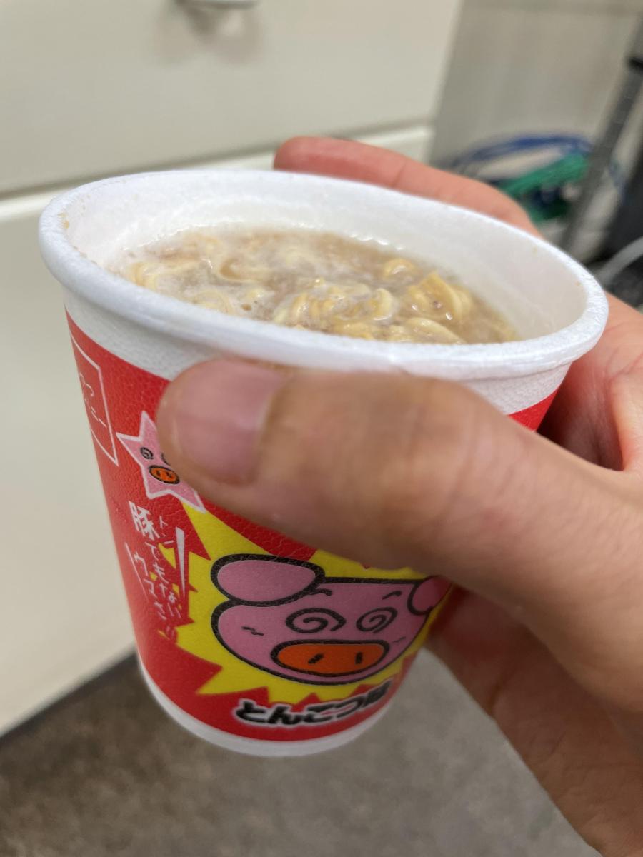 見ての通り小ぶりのカップ麺なので量は少ないです。おやつとして、もしくはスープとして飲むのにちょうどいいボリュームです。スープは臭みがなくてまろやかで飲みやすいとんこつ味。こってりすぎないのでおいしいです。塩味も強すぎないので好きです。