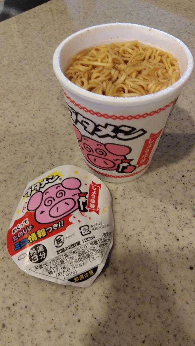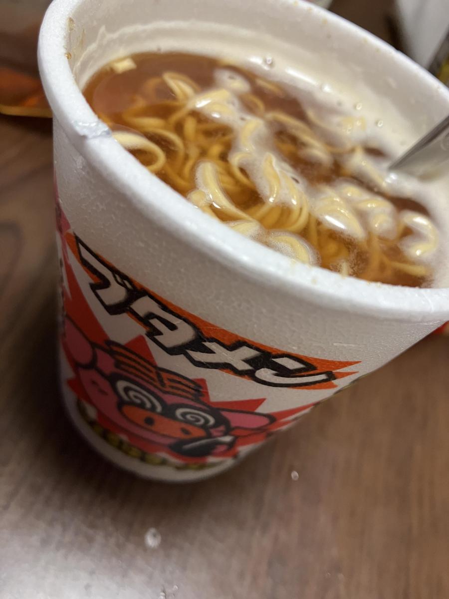 普通のブタメンが好きなので、しょうゆも購入してみました。名前の通りしょうゆ味のスープで、チキンラーメンと同じ味がしました。旨味はありましたが、とんこつの旨味だったのでしょうか。とんこつらしさがよく分からず、塩気強めのしょうゆラーメンでした。決して悪い味ではないのですが、普通のブタメンのほうがずっとおいしいと思います。