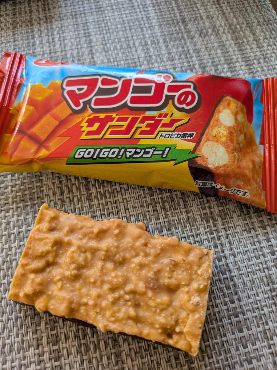ブラックサンダーのマンゴーフレーバー。コンビニで値引きされていたため何個か購入しました。