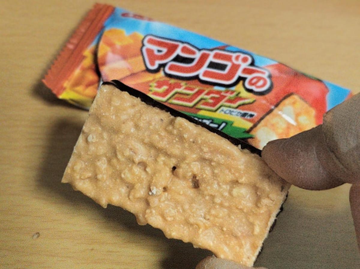 大好きなブラックサンダーの食べたことないフレーバーを見つけたので購入してみました。内側はザクザクしたマンゴー味のクッキー、表面はおなじみのミルクチョココーティング。食べていて真っ先に思ったのが、香料がきついという点。マンゴー香料が不自然で、しかも香りのレベルが強かったので、とても小さなお菓子なのに食べていて辛くなりました。マンゴーのクッキー部分は少し酸味もあり甘酸っぱい味で、ミルクチョコとは相性が悪い気もしました。ザクザク食感と表面のミルクチョコはよかったのですが・・・。