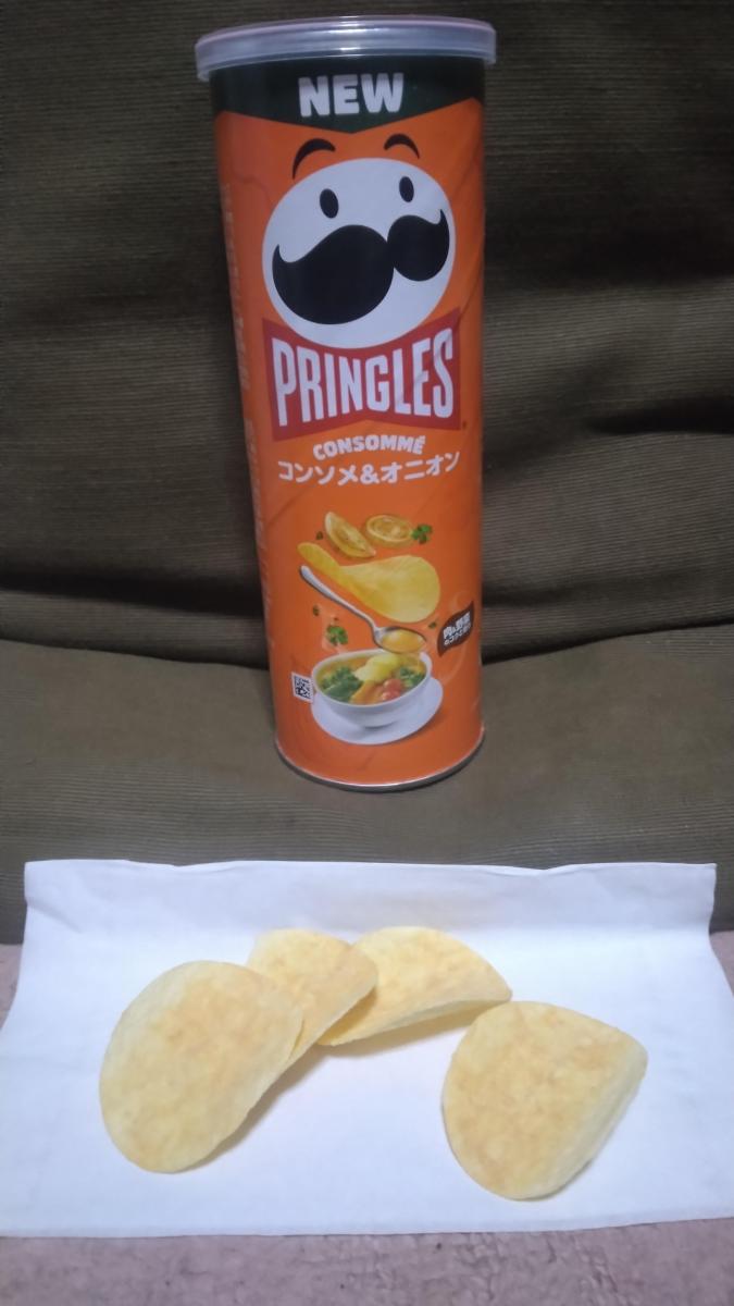 プリングルスのコンソメ&オニオン味を食べた事がなかったので気になり購入してみました。チップスはザクザク軽くて美味しいです。食べてみると味はやや甘めのコンソメ味な味わいで、オニオン感があまり感じられなかったのが少し残念でした。ですが、食べやすかったです。また購入してみたいなと思いました。