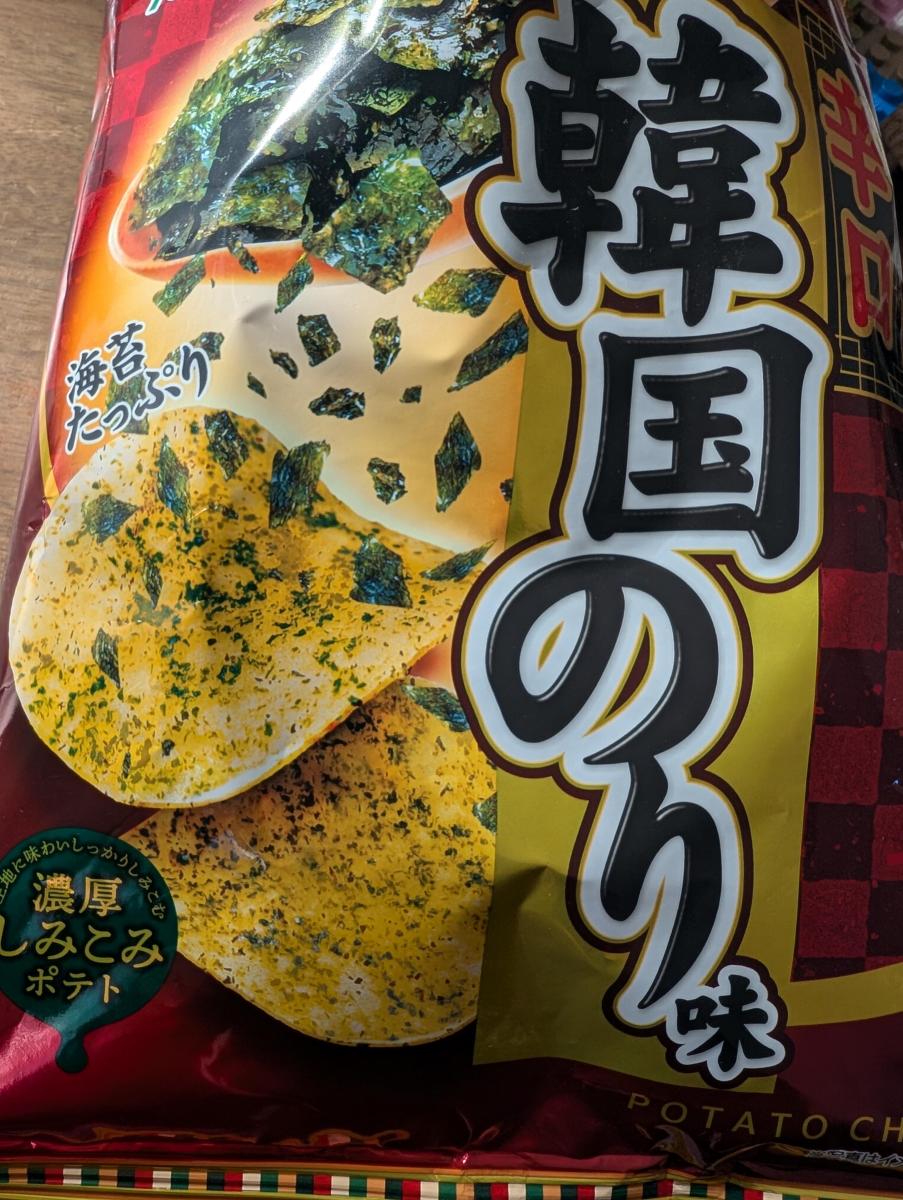 韓国海苔味のポテチ。辛口と書いてあったけど、そうでもなかった。もっとしょっぱくてもいいかな(私の好みです)ポテチ1枚1枚の表面についてる海苔は、多い気がした。味も濃い方かな。美味しかったです。