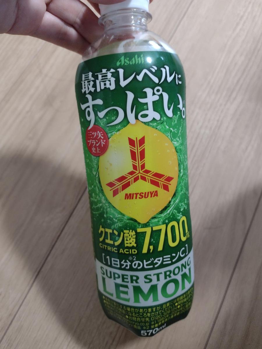 普通の三ツ矢サイダーと比べてだいぶ酸味が強く、甘さもかなり強く、全体的に味が濃かったです。酸っぱさの代表格といえばキレートレモンですが、それと比べると酸味はそれほどでもなかったですが、三ツ矢サイダーとしてはたしかにスーパーストロングかと思います。炭酸も強めな気がして、味は濃いですが爽快感がありました。濃いのでガブガブ飲める味ではなかったですが、暑い日にコップ一杯飲んだら甘味と酸味で元気が出ました。