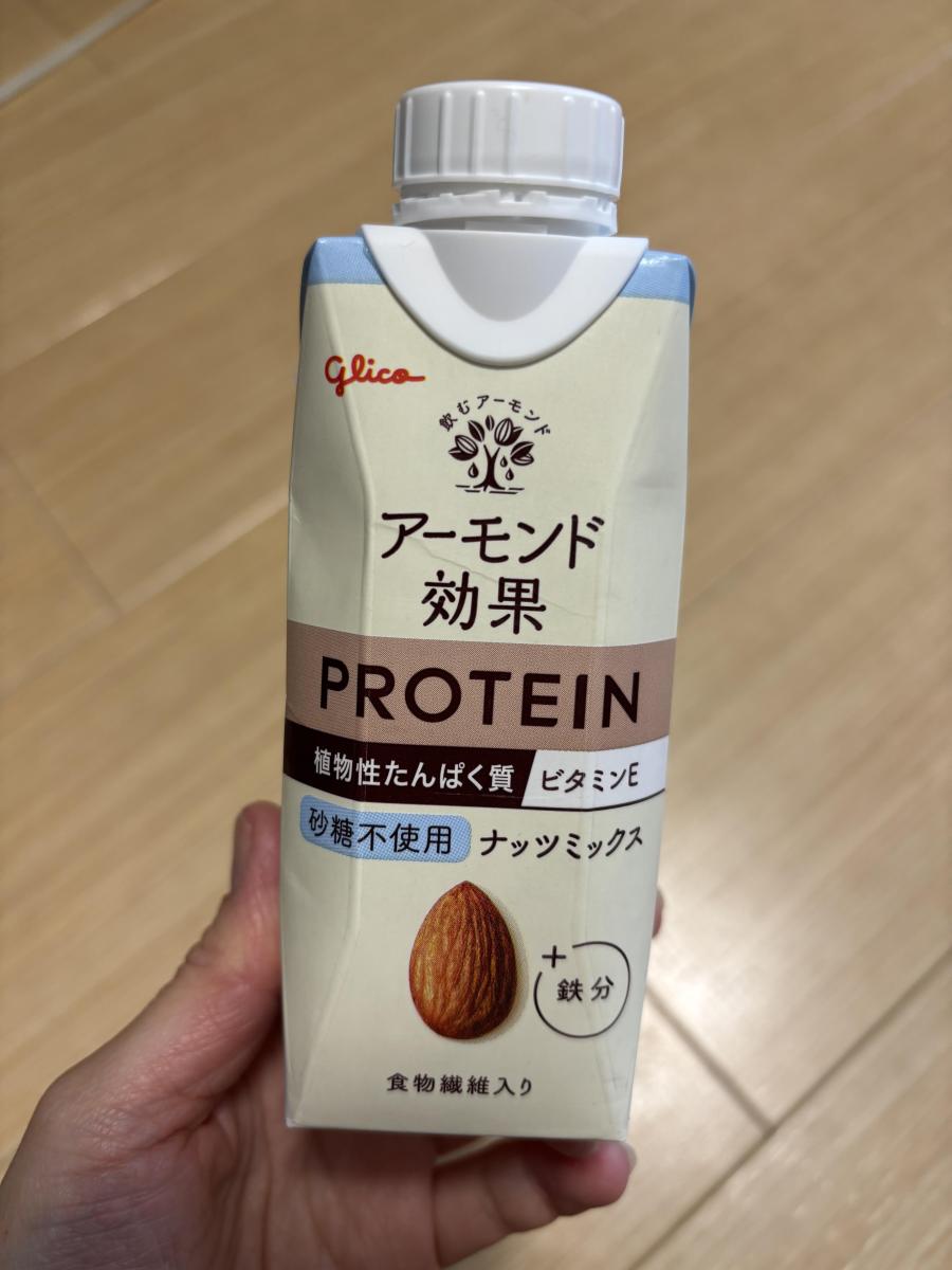 コンビニで見かけて購入。アーモンド効果のプロテイン!こちらからもプロテインタイプが出ていたんですね。