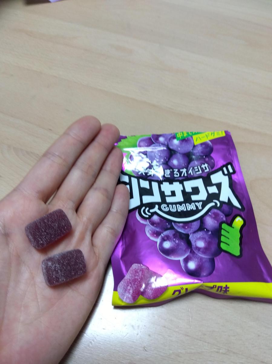 少しハードなグミです。噛みはじめは美味しいグレープ味でしたが噛み進めるうちにかなりスッパクなってきて これ以上スッパクなったらヤバイと思いだしたころに酸っぱさ薄れてきて 食べ終わりには甘いグレープ味になりました。