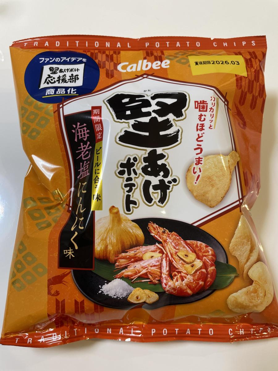 にんにく好きなので、スーパーで特売価格だったし迷わず購入しました。堅あげポテトシリーズは、普通のポテトチップスより噛み応えがあり、好みな人にはハマると思います。海老感よりにんにくの味が強く感じ、個人的には好きなフレーバーでした!
