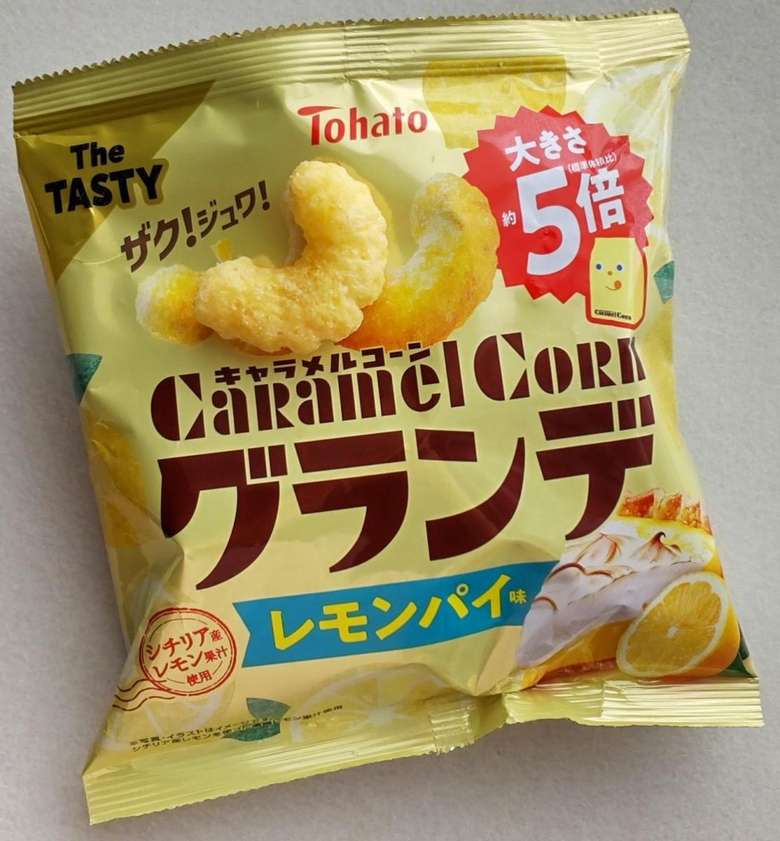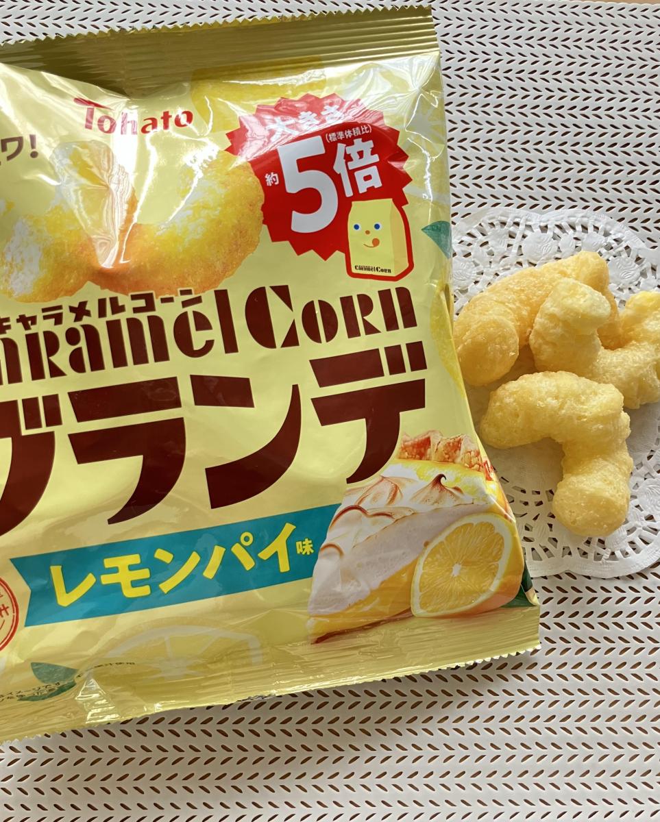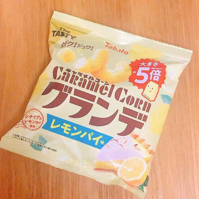 キャラメルコーングランデにレモンパイ味となんとも美味しそうなネーミングに惹かれ購入してみました。袋開けると、レモンの爽やかな香りがただよいました。1つがものすごく大きなサイズでサクサクとほどける様な食感ですが、大きいので食べ応えあります。レモンの酸味の後にマスカルポーネのチーズの味わいも感じられレモンパイのような味わいで、酸っぱいとチーズ好きには大変美味しい味わいでした。定番化してほしいです。コスパもいいのでまた買いたいなと思いました。