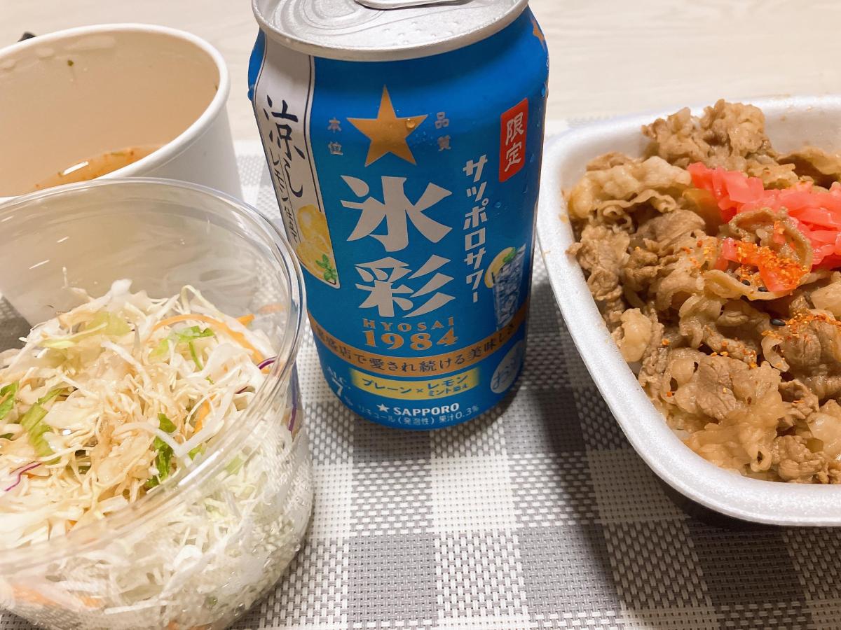 万博帰りで汗ドロドロ、夕食も手抜きだけどスッキリ飲みたい!って日の夕食。某チェーン店のテイクアウト牛丼で晩酌(笑)