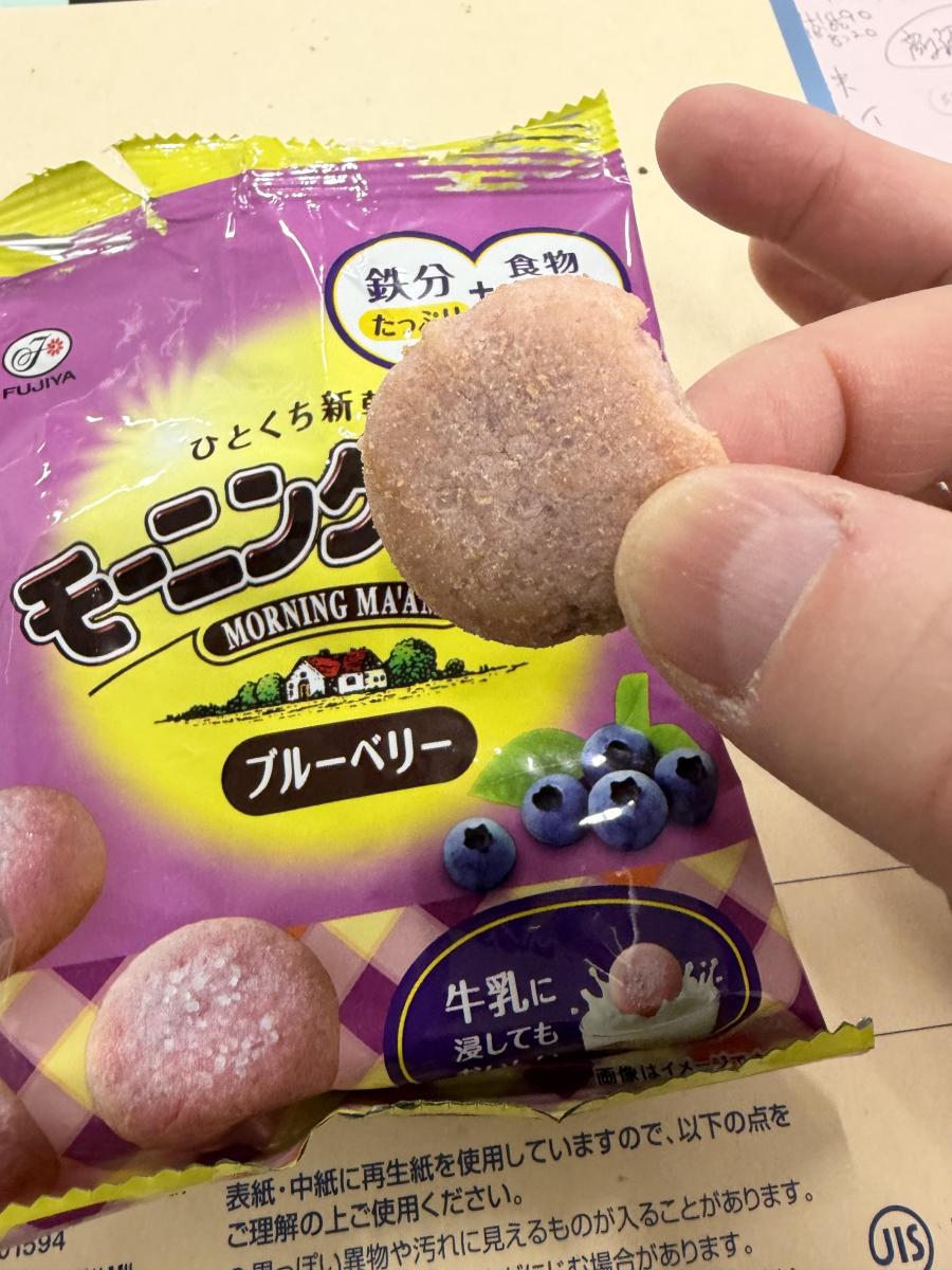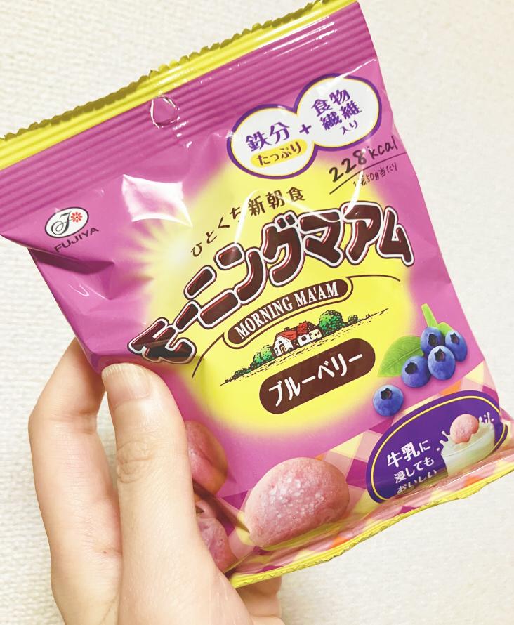 お馴染みのカントリーマアムより、小さめな1口サイズの大きさで食べやすく、食べるとカントリーマアム特有のしっとりサクサククッキーをきちんと感じました。ブルーベリーの上品な味わいで、特に感じはしないが、鉄分と食物繊維がプラスされているらしいので、美味しく栄養摂取できるのは良いなと思いました。