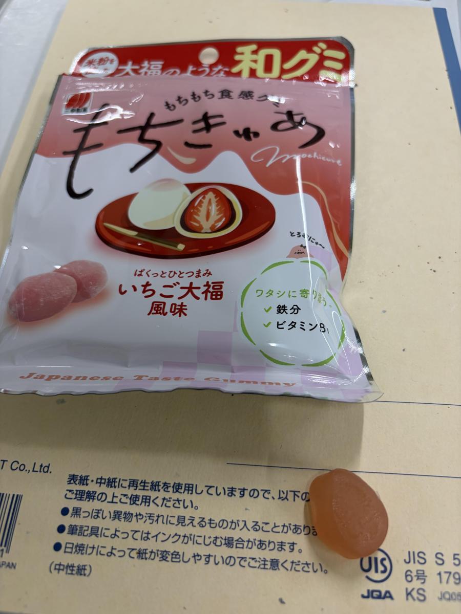 もちきゅあ いちご大福風味とグミで和風な味が大変気になり購入してみました。パッケージのかわいらしさもいいです。袋開けた時から、まさしくいちご大福の香りがしっかりと漂い食欲がそそります。食べると、ふんわりと感じた後に、もちっとした食感でグミではなく本当にお餅を食べているかのようで再現性がすごいです。米粉が使われているのも安心でいいです。量が少なめなのががっかりですが、大変美味しかったです。