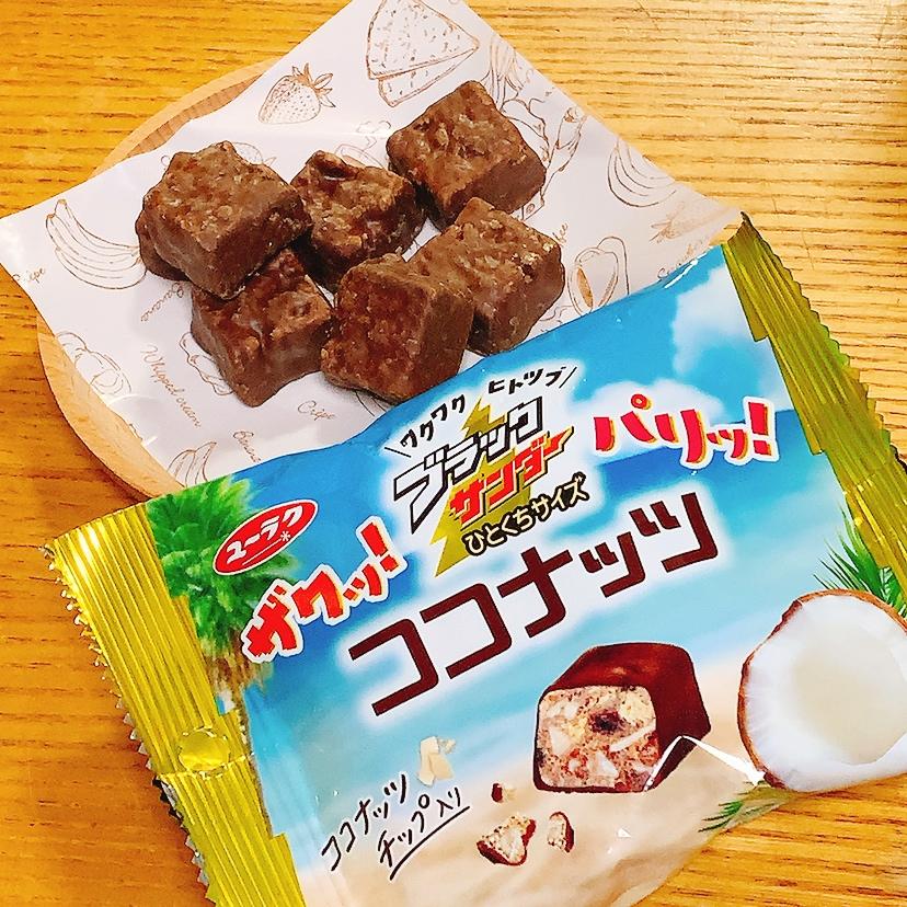 ローソンで見つけました。ココナッツ味のチョコレート、上に小さくブラックサンダーと書いていたので、ブラックサンダーなら美味しいはずと思って買いました。