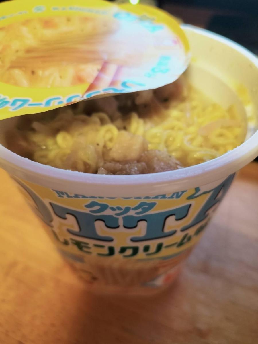 レモンの匂いはするものの、味的には塩味のスープという感じに思いました。特にクリームのコクがある訳でもなく、あっさり薄味の印象です。麺も普通。後、しっかり混ぜないとスープの粉が溶けずにそのままだったので、気をつけないといけないと感じました。