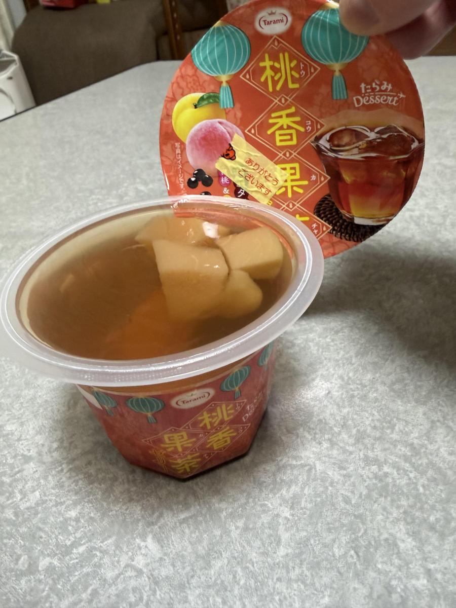 桃のゼリーにタピオカを入れ、ウーロン茶を加えて作られたゼリーのようです。烏龍茶の香りはかなり控えめで、色合い以外はそれほど表に出ていない気がします。風味がちょっと烏龍茶かな?とは感じますね。食べ応えのあるサイズの桃の果肉がたくさん入っていて、満足できました。
