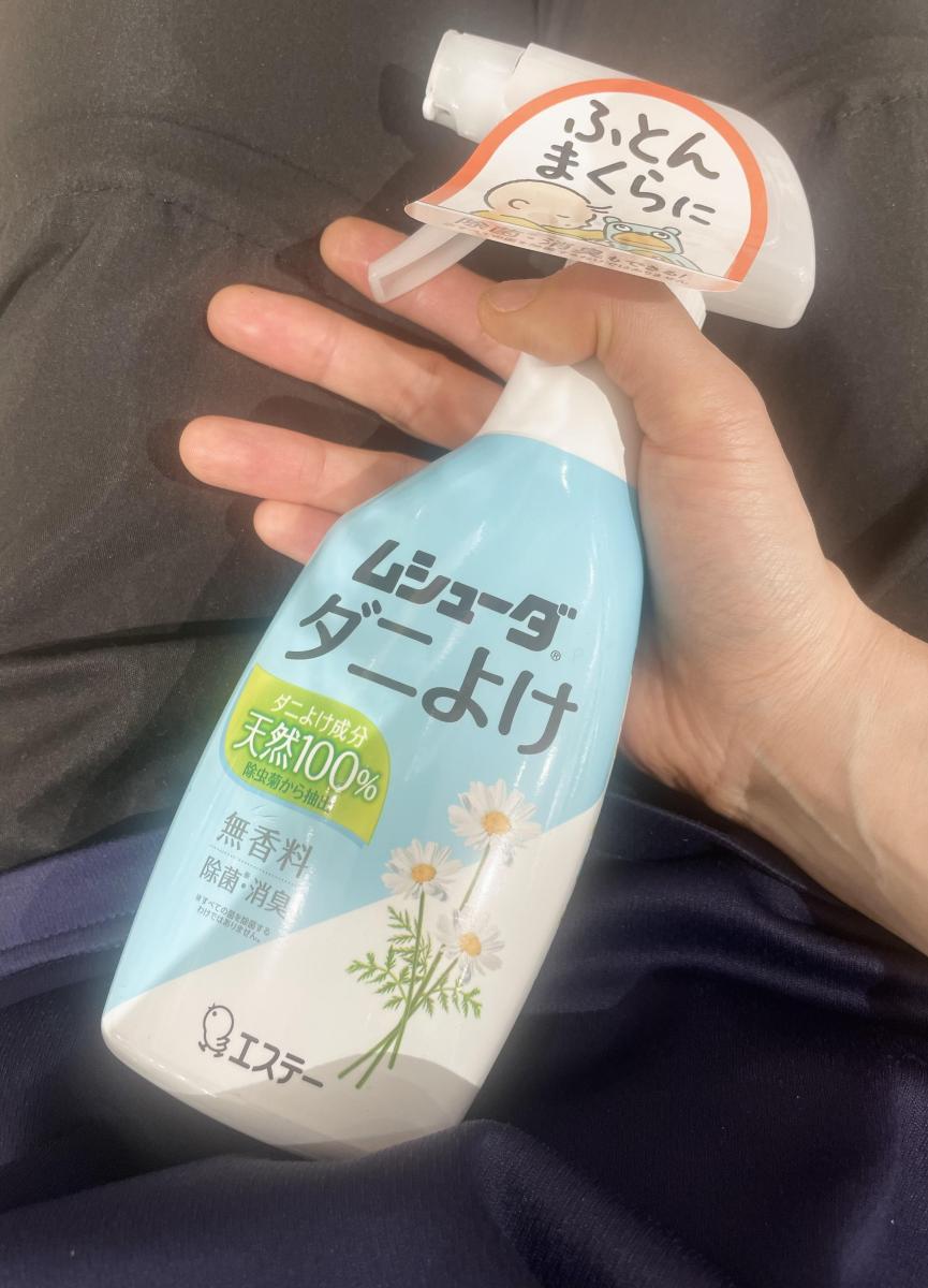 ムシューダのダニよけはスプレータイプで気軽に使えるのが便利。天然成分100%なので安心して使えるのも嬉しいポイントです。香りも強くなく自然な感じで気にならず、寝具に使いやすいです。手軽で使い勝手の良いダニ対策アイテムです。
