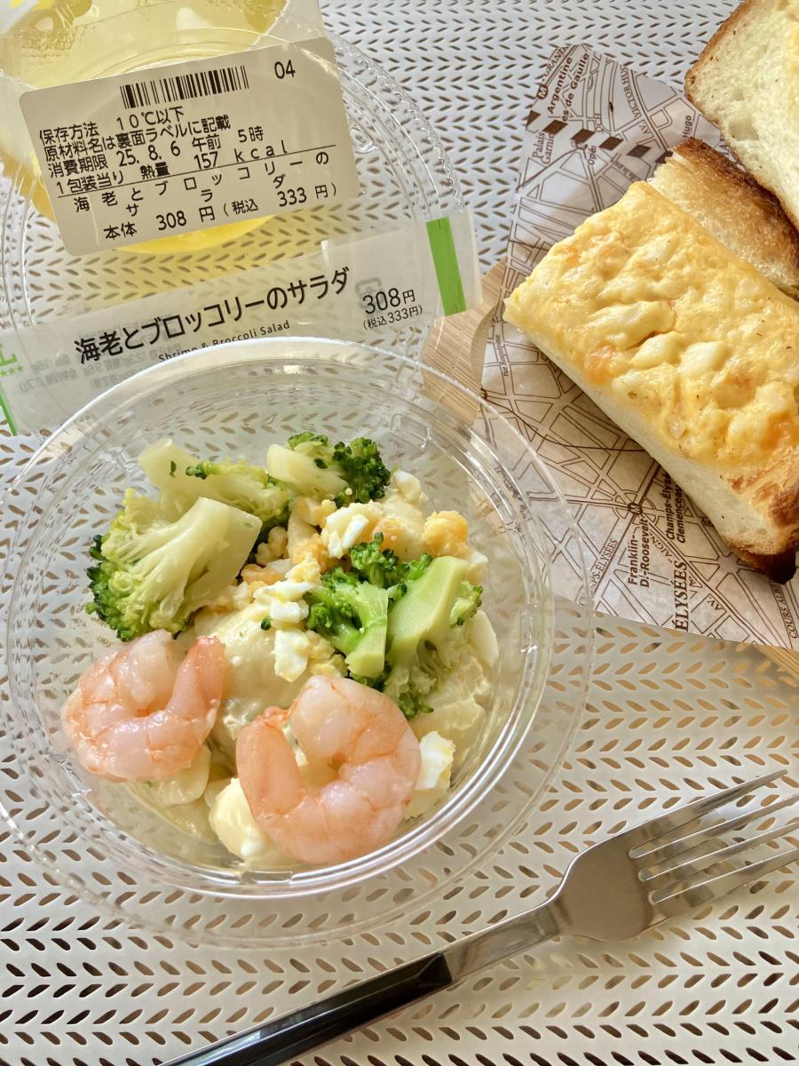 ブロッコリー、海老、卵とマカロニのデパ地下のようなサラダ。卵のコクがたっぷりでマヨネーズの酸味もまろやかで濃厚。