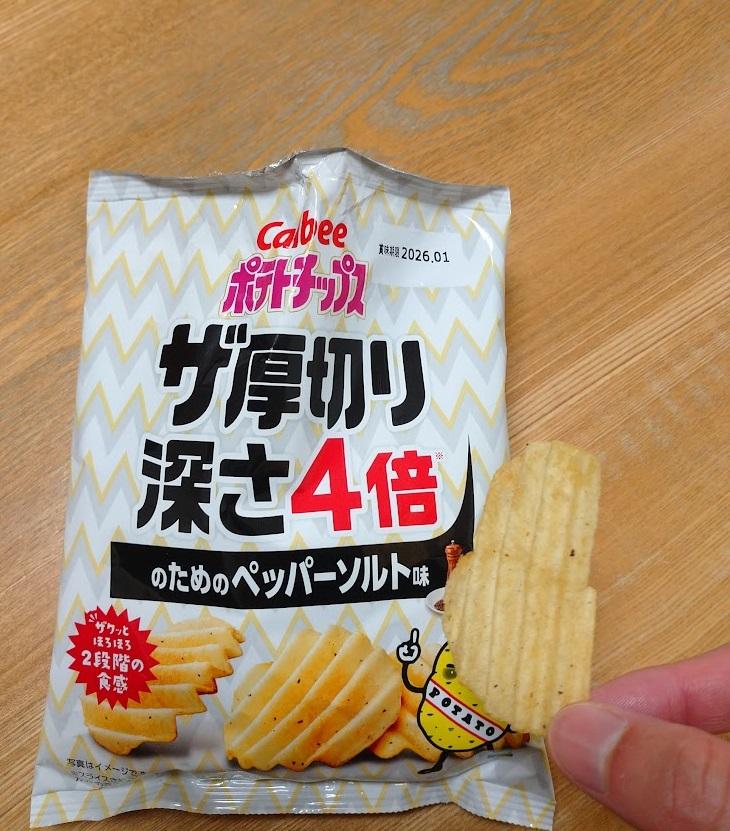 どのポテトチップスの4倍を指しているのかはわからないが、ふつうの物よりは厚みがあるが4倍かと言われるとそうとは思わない。だが、厚みも食べ応えがあるし、ブラックペッパーもほどよく辛みがあってとても美味しいポテトチップスだ。