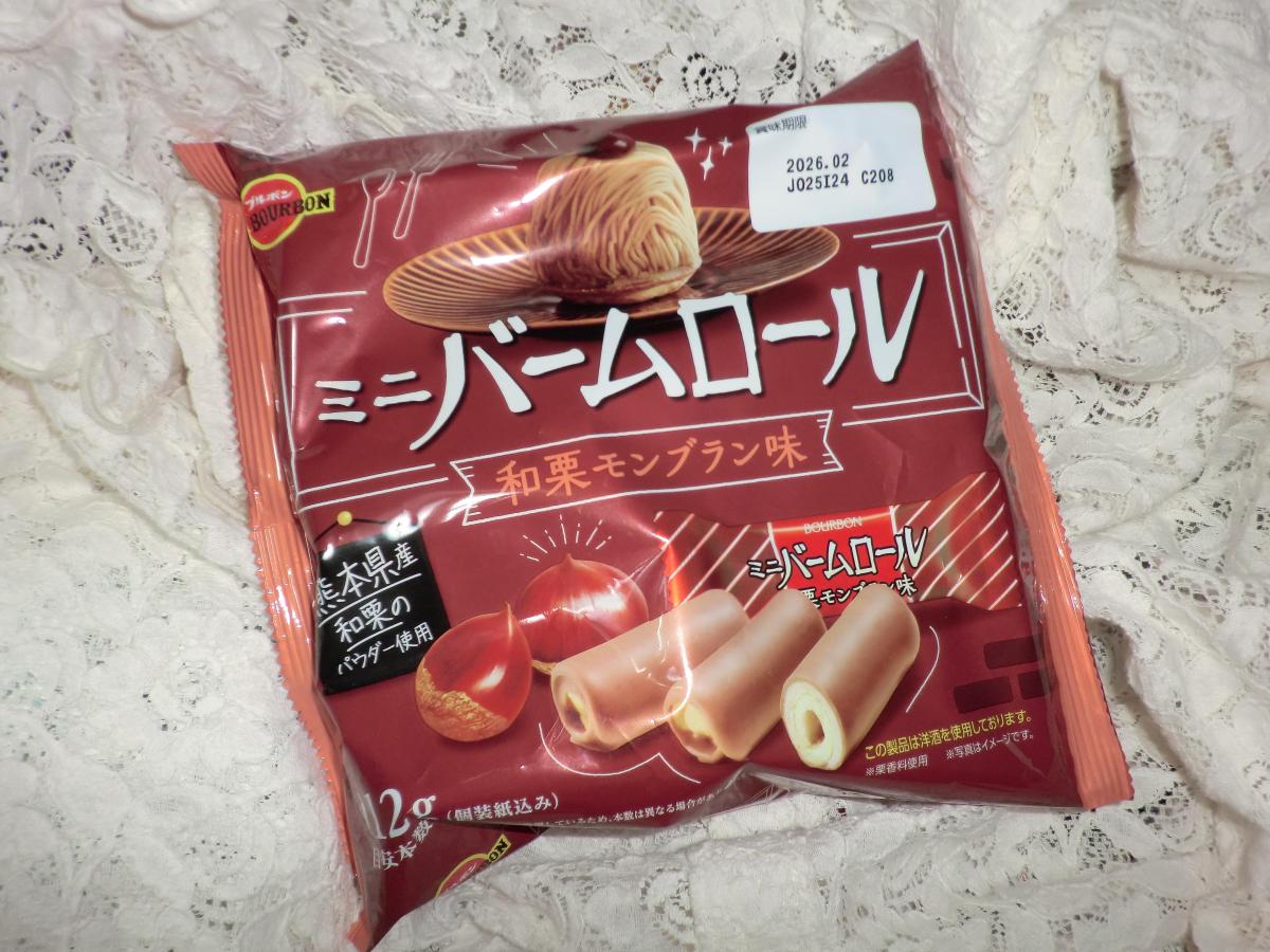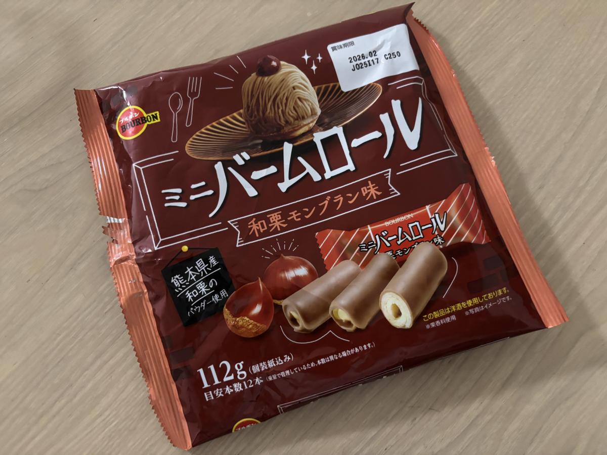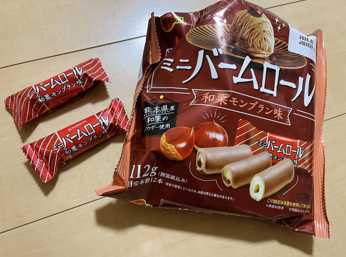 赤茶色のパッケージが目に留まりました。ミニバームロールの当た他しい味、和栗のモンブラン味が出ていたので、さっそく買ってみました。