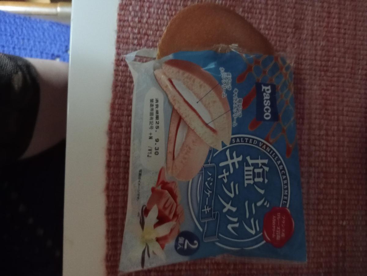 塩バニラキャラメルパンケーキって初めて見るかもって思って購入してみました。パンケーキの生地はふわっとしていて、しっとり感もあります。サンドしてあるキャラメルクリームもホイップクリームもどちらも塩バニラ味になっています。どちらと言うとホイップクリームの方が塩バニラ味が濃い感じかなと思いました。しっかりした味わいなので1枚食べると満足します。2枚食べると少しくどく感じてきちゃいました。2個入りなので、1枚づつ食べるとコスパも良いのかなと、でも1個ではお腹は膨れないので、おやつとして食べるには良いかも。ちなみに朝ごはんとして食べたので。