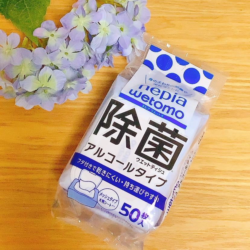 アルコールタイプのウエットティシュ、常備しておくととても便利です。食事の後、食べこぼしなどのテーブル拭きにぴったり。