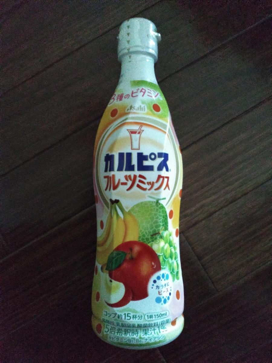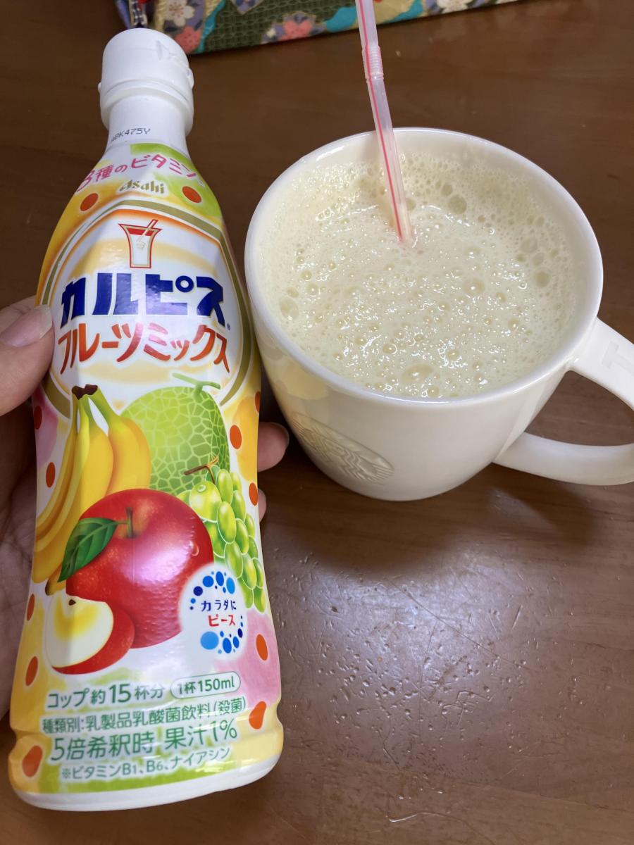 ミックスジュース系の味になるのかなと思っていたのですが、カルピスの乳っぽい感じと組み合わさることによってフルーツ牛乳のような味わいになっていました。
