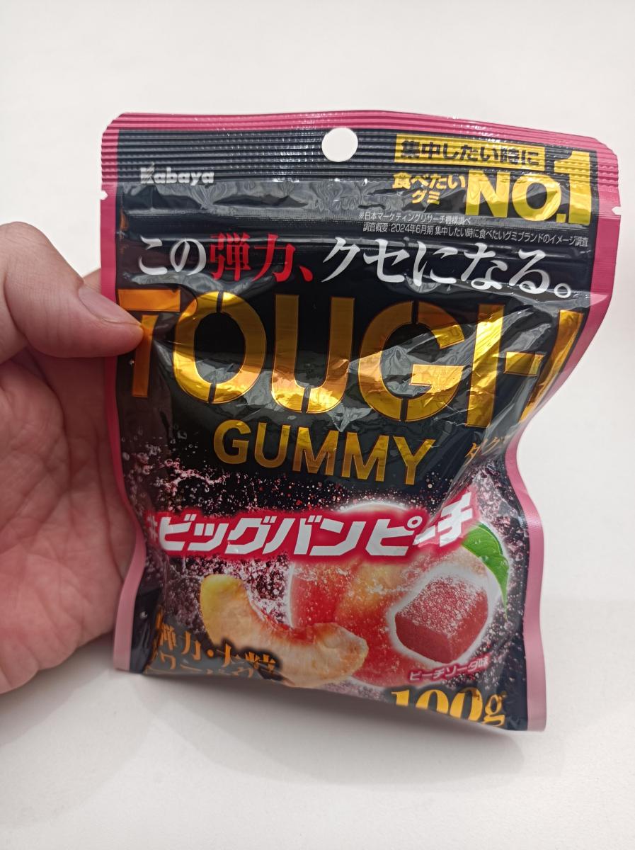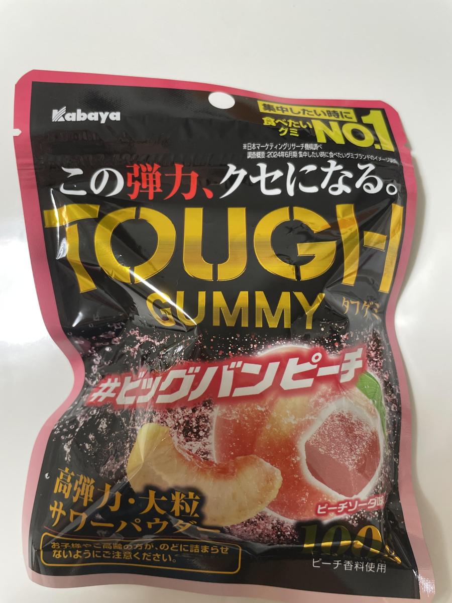 しっかりした噛みごたえがあるハード食感のタフグミのピーチ味バージョンです。表面のパウダーの爽やかな酸味とピーチ味の甘みのバランスがよく満足度高いです。