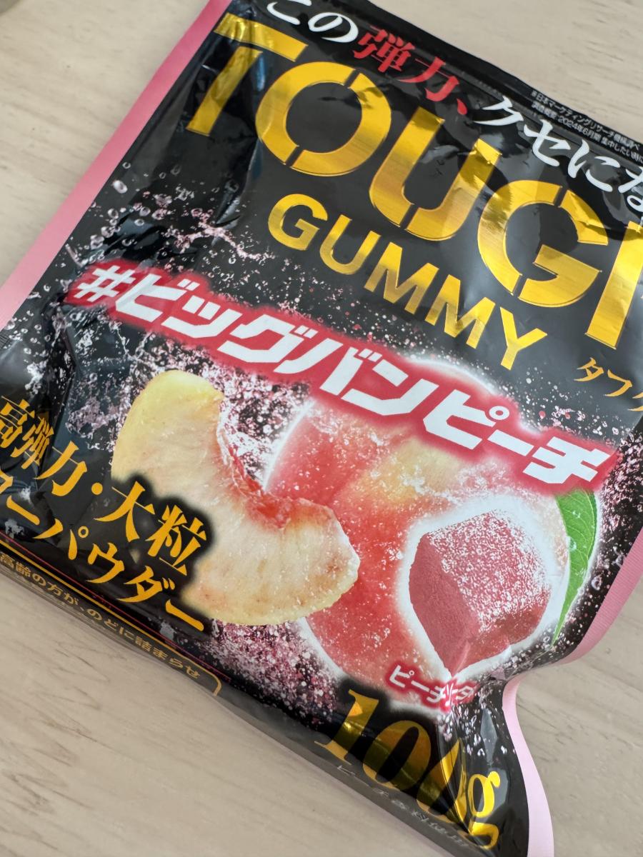 タフグミシリーズらしい、ハード系のグミでしっかりした噛みごたえでした。最初はピーチの香りが強すぎて、トイレの芳香剤を彷彿とさせるような強い香りを感じました。笑でも、最初だけでその後は甘酸っぱいピーチの味、香りを楽しみながら食べられました。