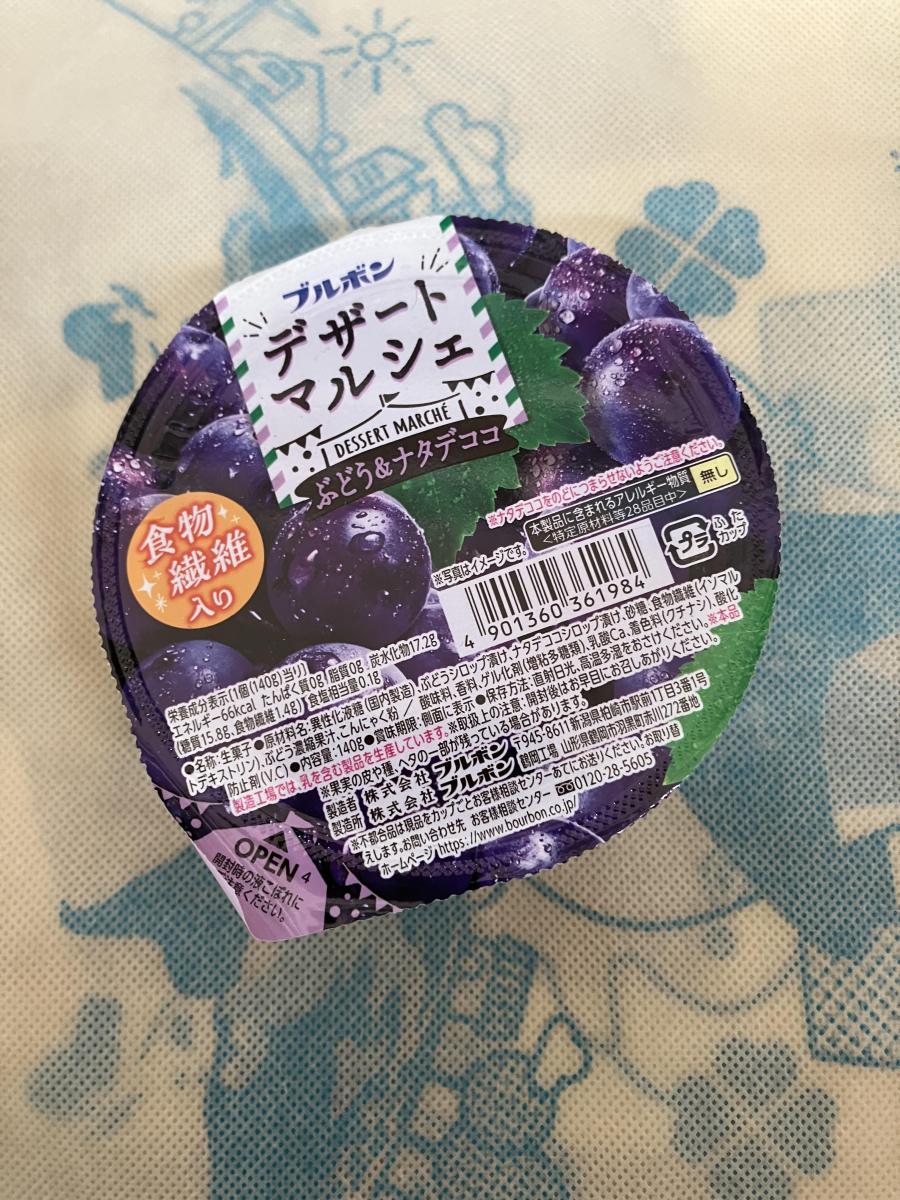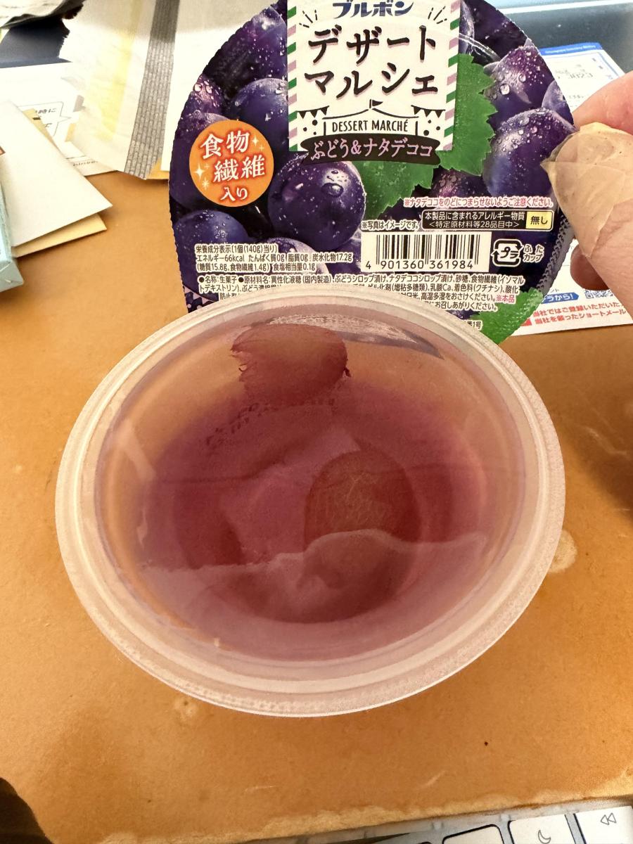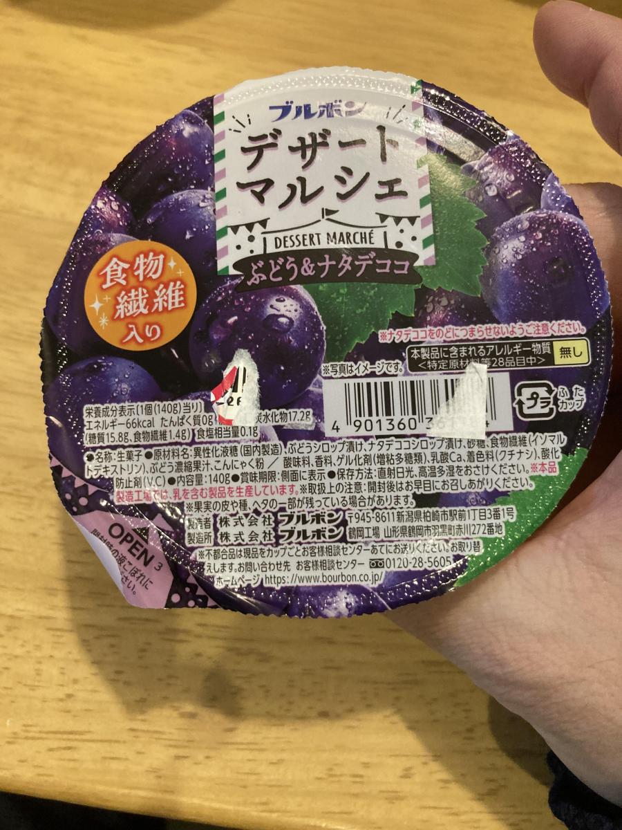 デザートマルシェシリーズはどれもコスパがいいのですが、その中でもぶどう&ナタデココは特に完成度が高いと思っています。お手頃価格でボリュームたっぷり、ぶどう果肉入り、ナタデココ入り、ぶどうの果汁感あるゼリーがおいしい、カロリーもあまり高くない。完璧ですね。ゼリー部分のぶどう風味がみずみずしく、自然な味わいでおいしいです。また個人的には果肉とナタデココ入りなのが素晴らしいと思っていて、ぶどうを食べた感じが楽しめますし、ナタデココでゼリー部分の食感に変化があるので最後まで飽きずに食べられます。