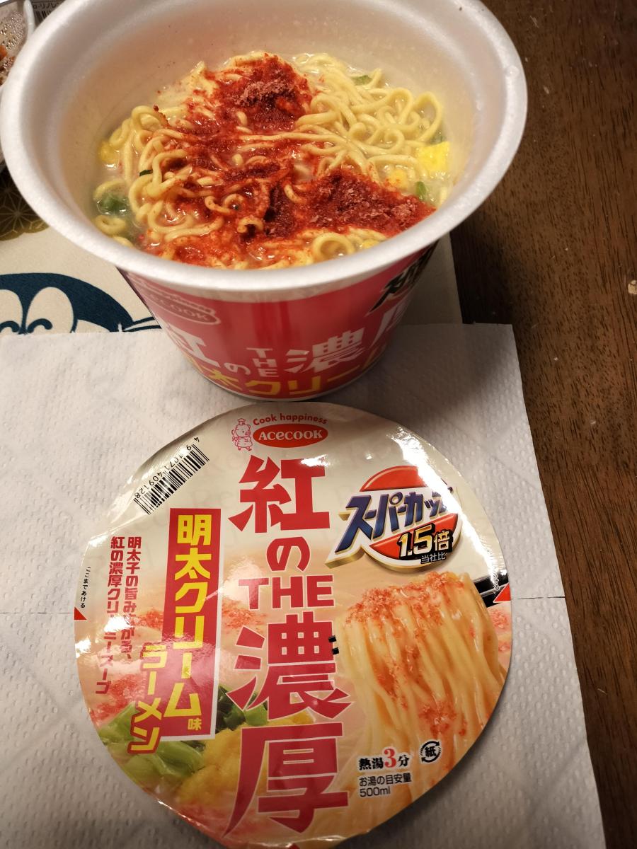 明太系パスタが好きなので、ラーメンとは珍しいと思い購入しました。麺が黄色っぽくてコシがあって、好きなタイプの麺でした。美味しかったです。細麺が好きですが、こちらは真ん中くらいかな?細麺ではないはず。カップ麺詳しくないのでわからないのですが、食べ応えがありました。パスタの明太子クリームと想像して、食べると全然味は違いました。後でかける明太のふりかけ?をかけたところが、明太の味が濃くて美味しかったです。混ぜるとスープがピンク色に変わり可愛かったです。一瞬何を食べているのだろうと思いましたが。濃厚と書かれていますが、トロミはありますが、マイルドで少しクリーミー感。濃い味わいだとは思いませんでした。かと言って、あっさりでもないんですけど。明太味がもっとほしかったかな。スープも全部飲み干しました。ご馳走様でした。