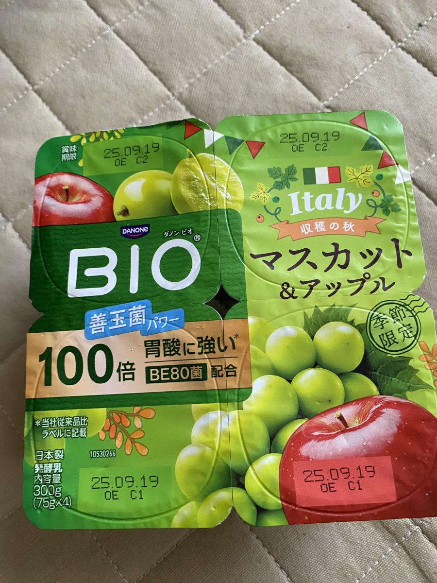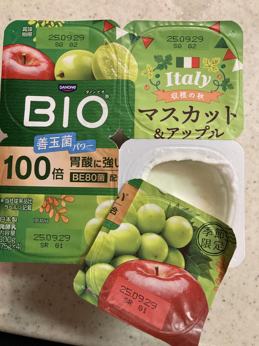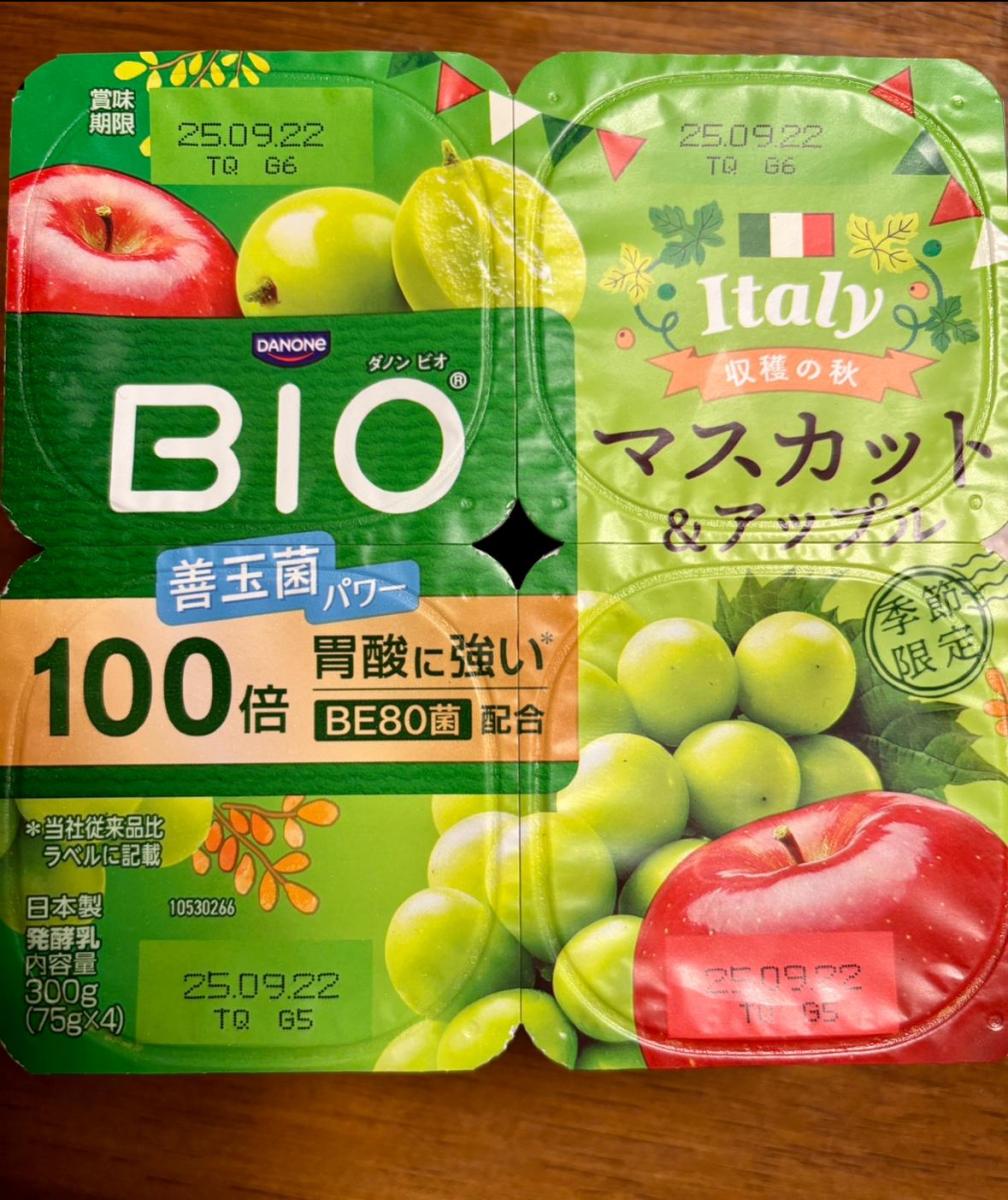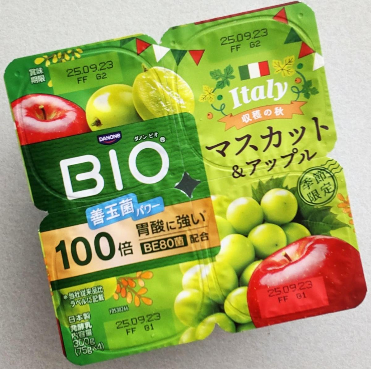 いつものビオヨーグルトに目新しい種類が並んでいたので買ってみました。マスカットとアップルの組み合わせです。