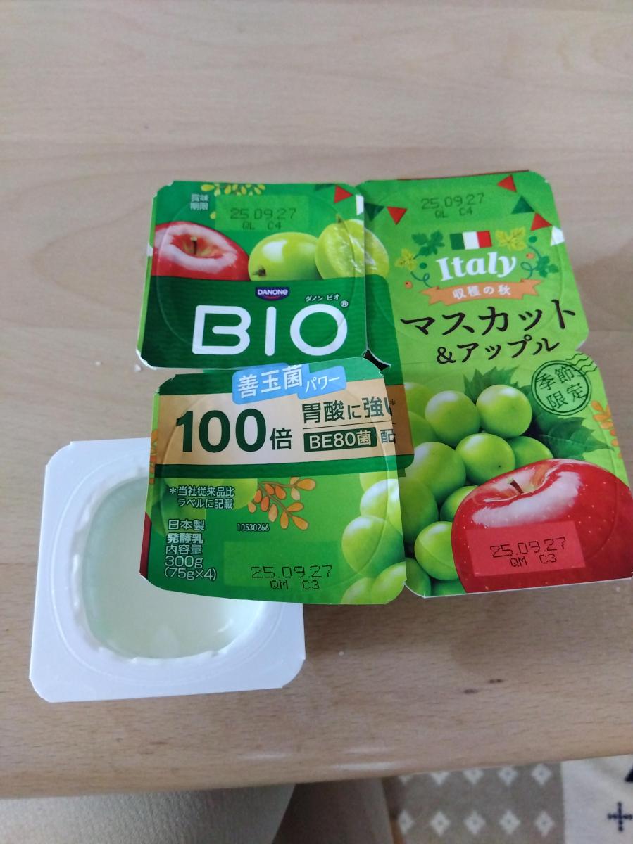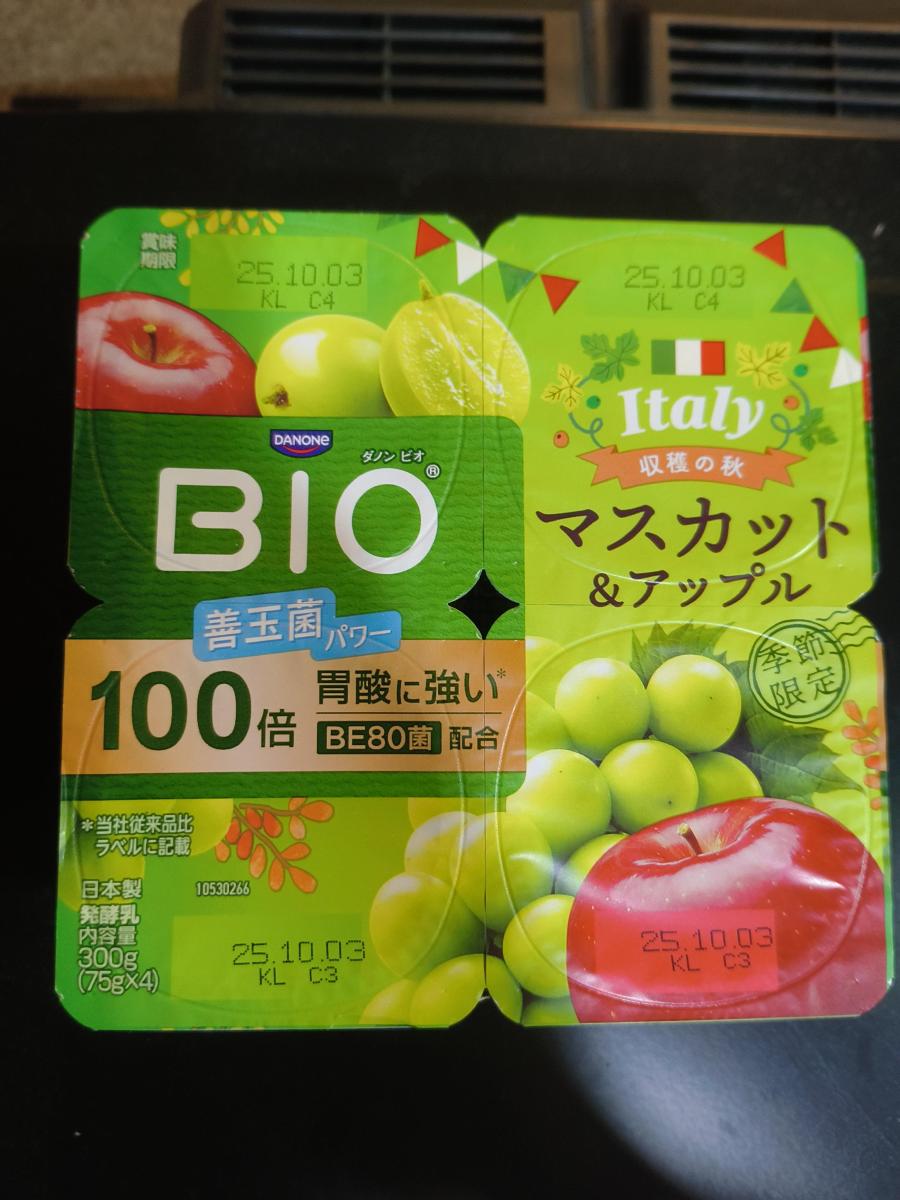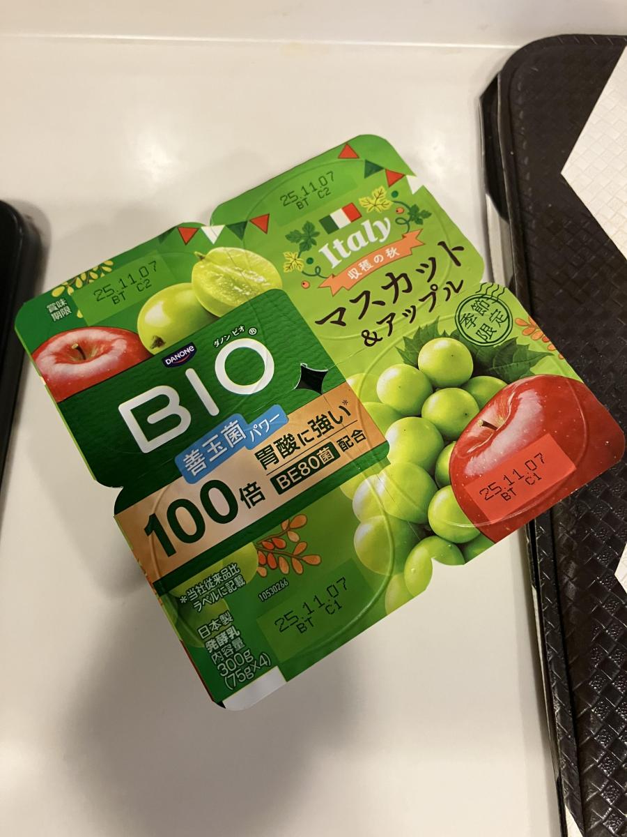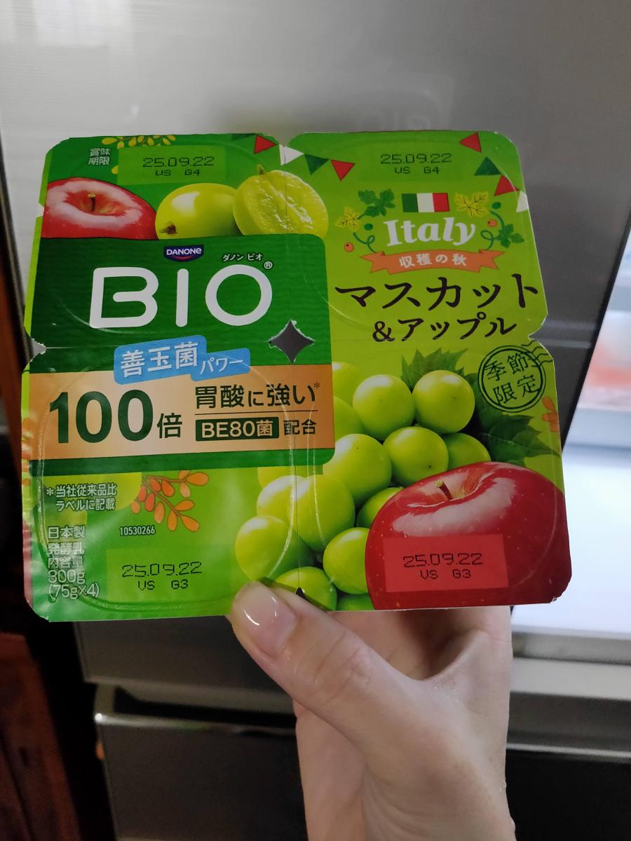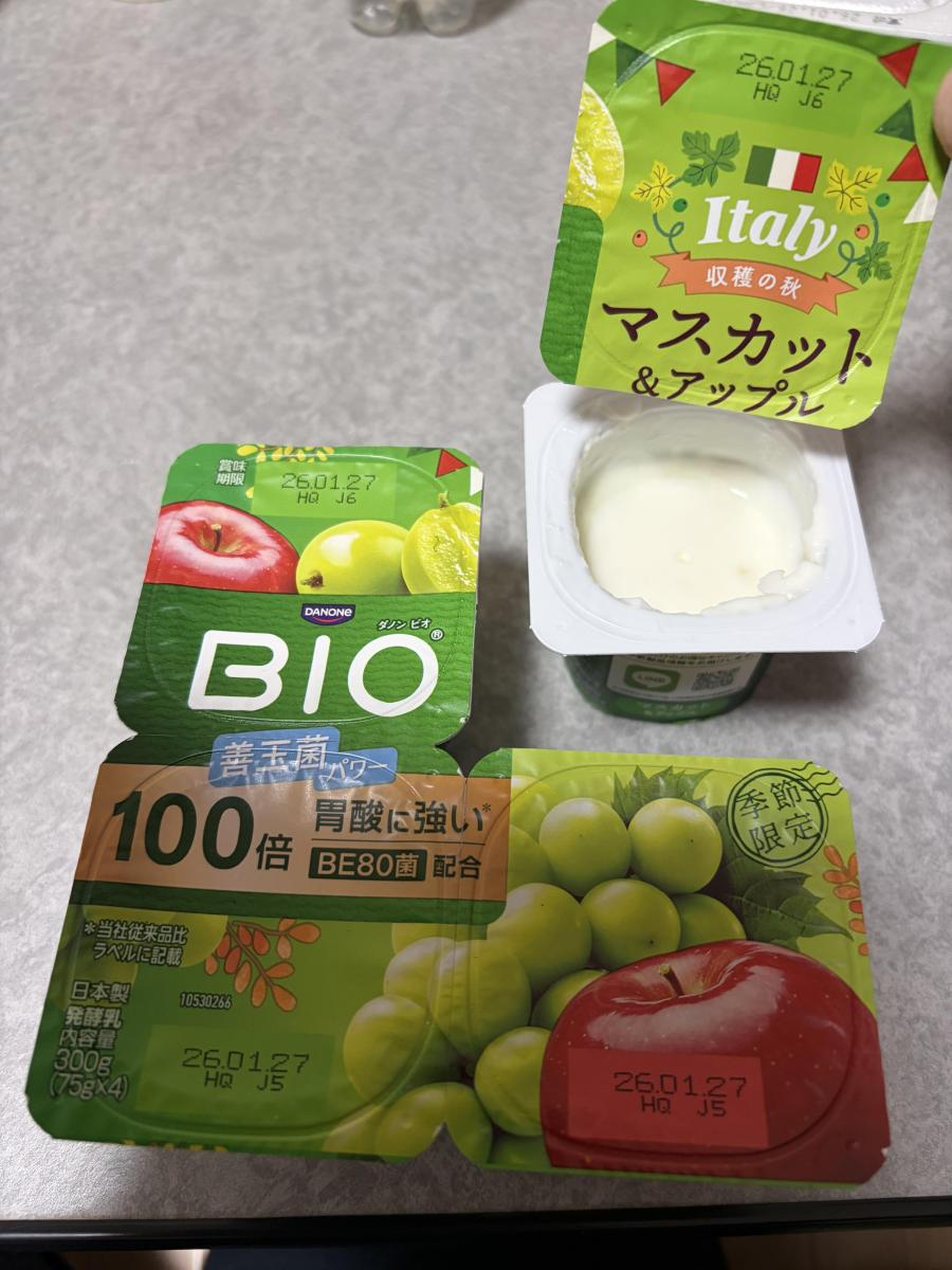 いつものビオヨーグルトに目新しい種類が並んでいたので買ってみました。マスカットとアップルの組み合わせです。