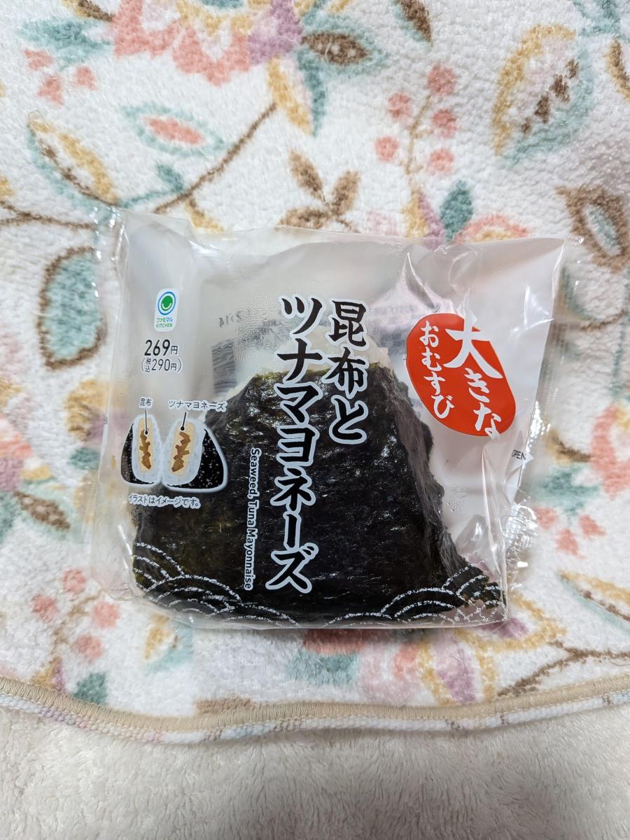丁度、大きなおむすびに目が留まり、昆布とツナマヨネーズという、たぶん好きな味だろうと想像できそうな、昆布とツナマヨネーズを買いました。確かにずっしりしています。