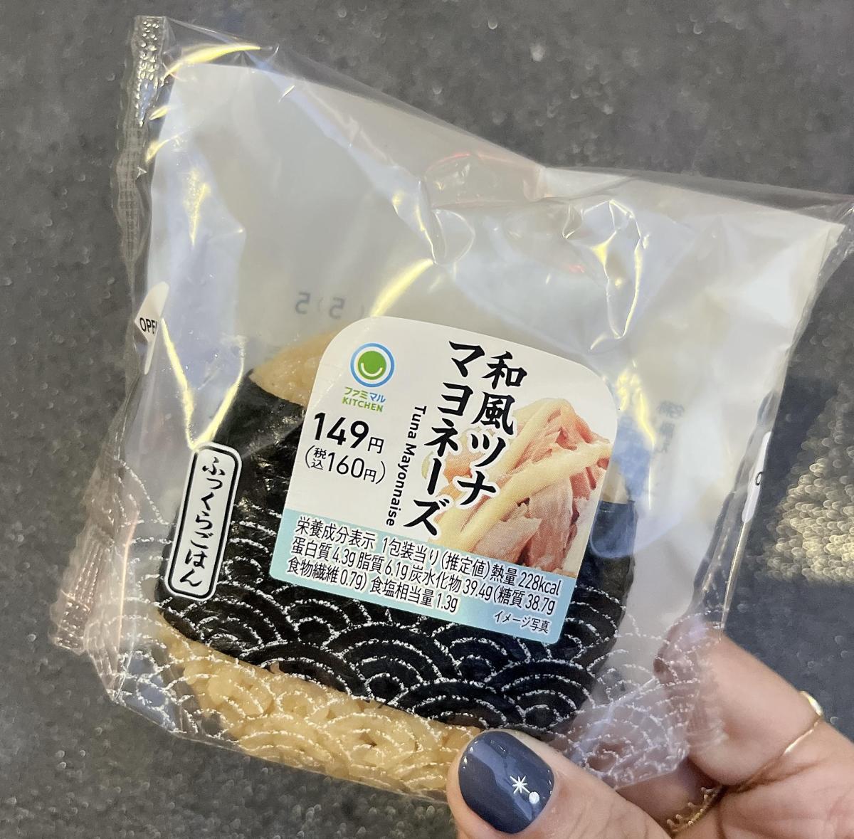 和風の炊き込みご飯のようなお米にまぐろとかつおのツナマヨネーズの組み合わせ。お米の硬さが程よく、おにぎり自体もふわっとして食べやすい。コクがあるマヨネーズで味付きご飯とも相性が良いし旨みたっぷり。海苔はしっとり系。風味が良くて全体をまとめてくれる感じ。ツナマヨ具材の量がもっと多かったらうれしかったなぁ…