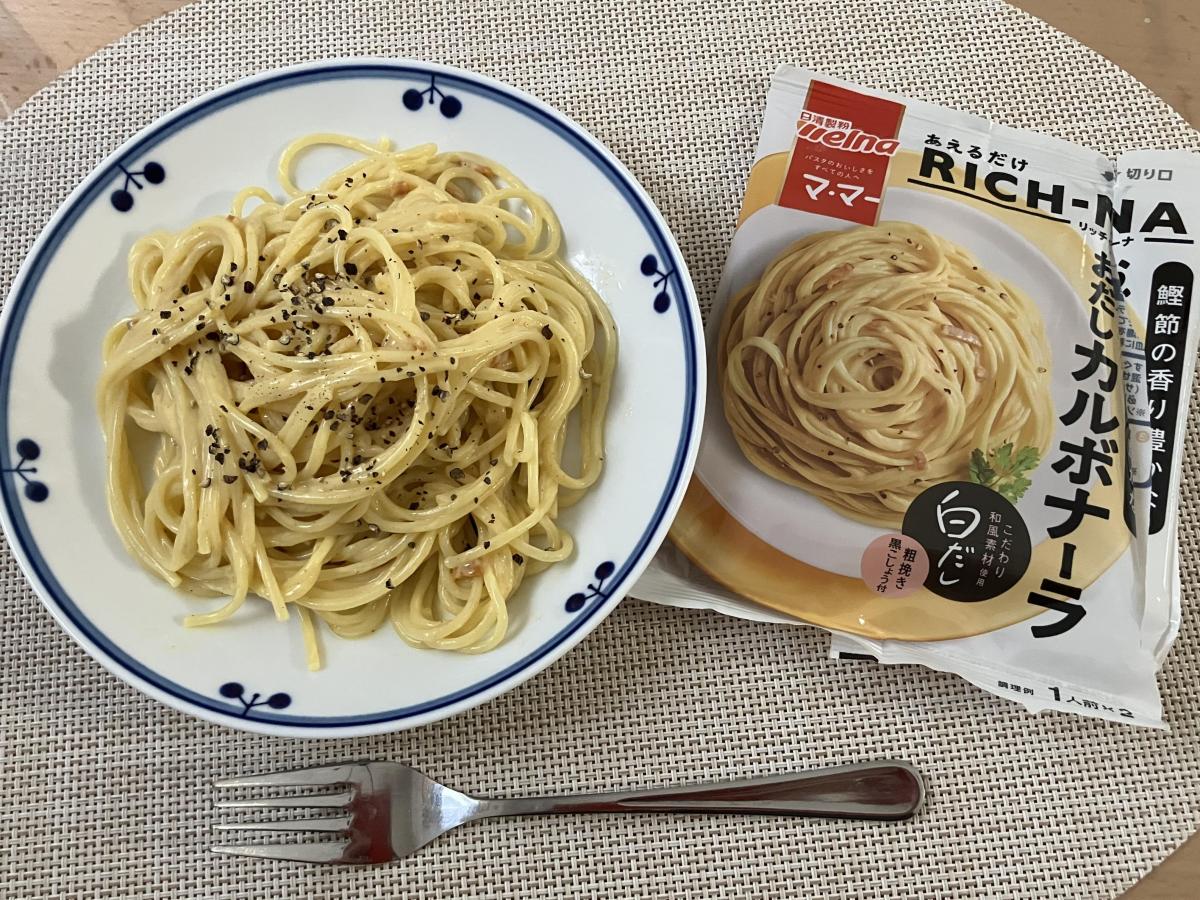 茹で上がったパスタに絡めようとパッケージを開けると鰹のお出汁の香りがフワーンと香りました。これはもしやかなり和風寄りの商品か…?と思いながらも付属の黒胡椒をかけて食べ始めましたがお味は普通にクリーミーなカルボナーラで美味しかったです。ベーコンチップのようなものが入っています。黒胡椒が別添えなのが特に食べた時に本格感があって良かったと思います。クリーミーなカルボナーラにピリリとした黒胡椒、本格的なカルボナーラという感じがしました。それに白だしの風味も加わるのでこれは日本人の好みの味だろうなと思いました。またリピートします。