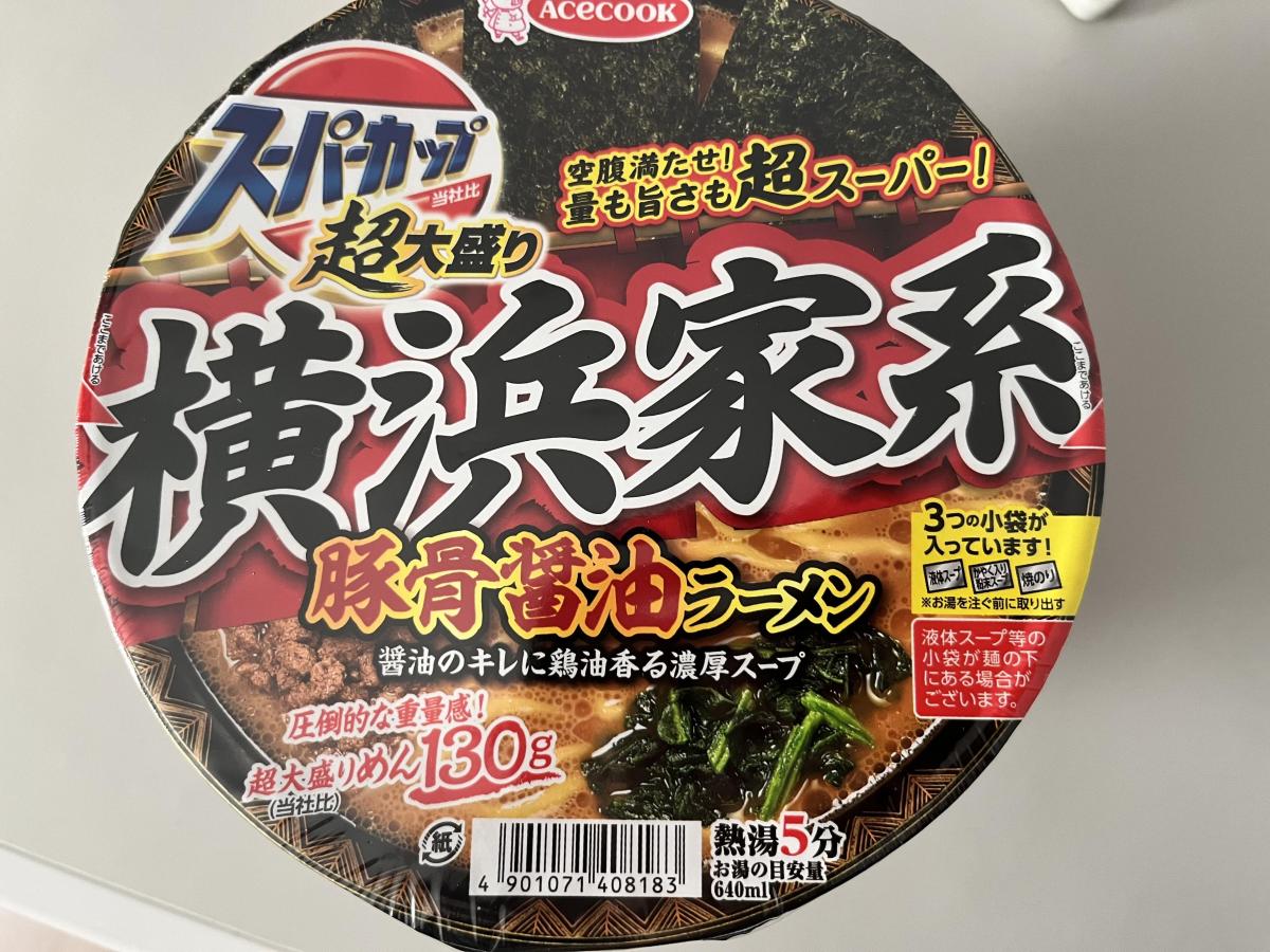 容器がとても大きくて見た目のインパクトは相当。バケツのようだなという感じ。食べてみても普通のスーパーカップよりもまだ多いのがはっきりとわかるボリューム感で、とにかくたくさん食べたいという人にはおあつらえ向きだと思う。味の方は横浜家系ということなのだけど、どうもしっくりこない印象で、確かに豚骨醤油で味も濃いめなのだけど、何かが違うような気はする。麺はスーパーカップらしいガシッとかみごたえのあるもので、これはこれでいかにもスーパーカップだと思えるもの。ボリュームアップにコストがかかっているのか、具材はさみしくて、一応文法どおりほうれん草が入っていて、海苔も3枚とここは頑張っているけども、チャーシューはなくてひき肉だけというのはちょっとね、という感じ。とにかくボリューム勝負はわかるけど、もうちょっと中身も工夫はほしいなと思った。