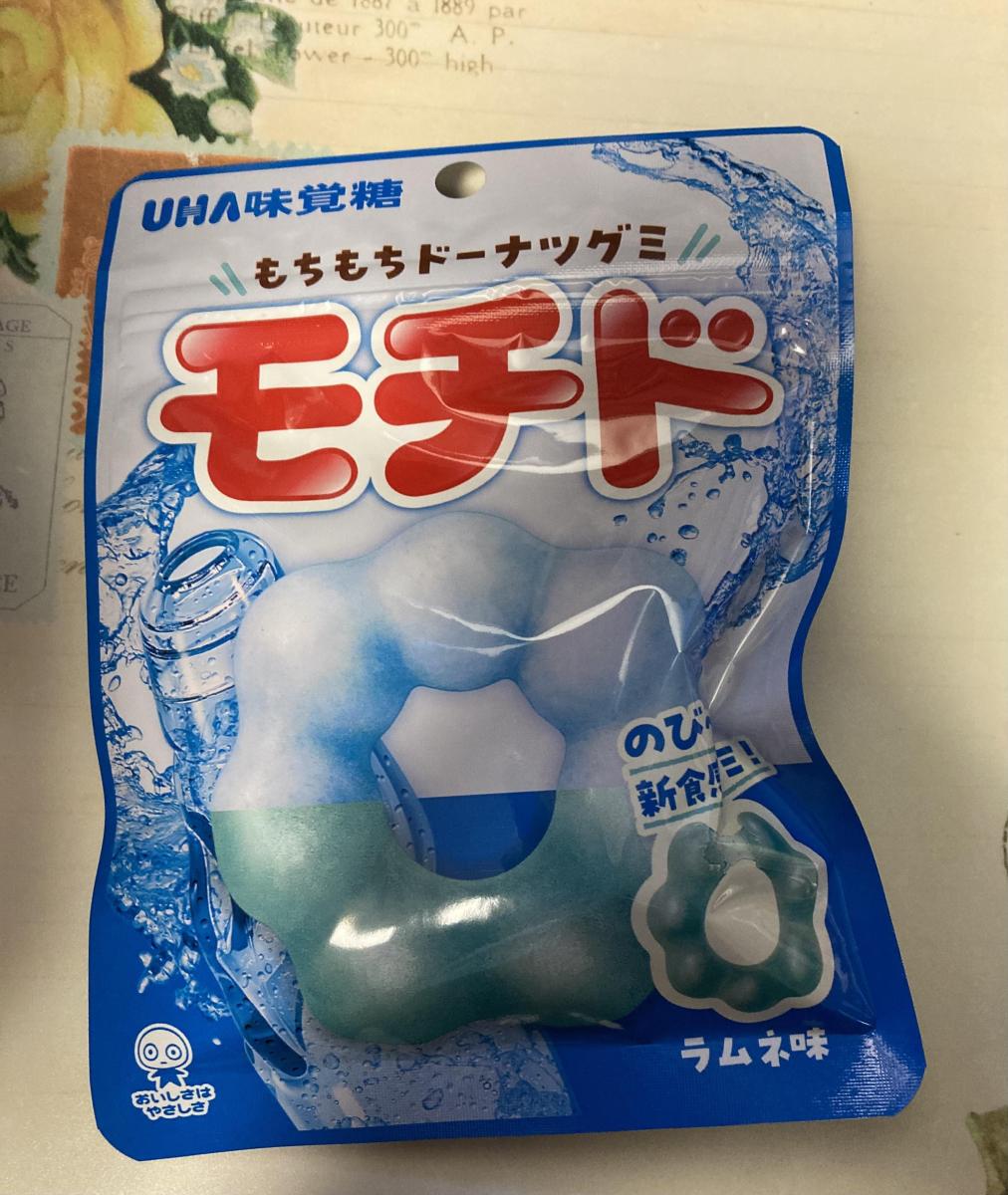 ドーナツ型の可愛いグミ。ラムネ味でとってもさわやかです。面白いのが食感!噛むとモチモチしていて、しかものびる!大人でも楽しめる新食感グミでした★*。