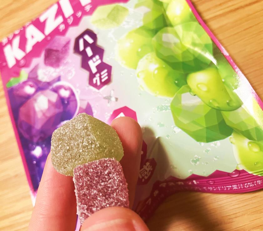 キュービック状のハード系で弾力が強いです。グレープとマスカットの2つの味が楽しめます。