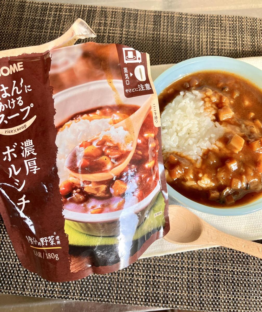 電子レンジで温めてご飯にかけるだけで出来上がり、湯気から漂うボルシチの香りがよく、角切りの人参やじゃがいもが入り食感もきちんと感じられて牛肉やトマトの旨みが詰まった濃厚なスープで美味しいです。